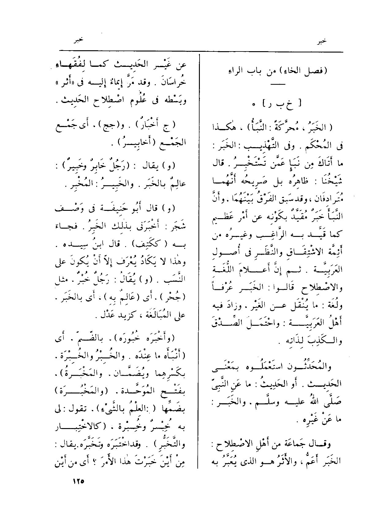 وَقَالَ جَماعَة من أَهْلِ الاصْطِلاح: الخَبَر أَعَمُّ، والأَثَرُ هُوَ الَّذِي يُعَبَّرُ بِهِ عَن غَيْر الحَدِيث كَمَا لِفُقَهاءِ خُراسَانَ. وَقد مَرَّ إِيماءٌ إِليه فِي (أَثَر) وبَسْطه فِي عُلُوم اصْطِلاح الحَدِيث.