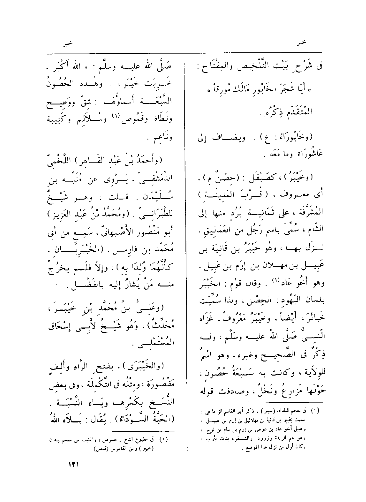 (وخَيْبَرُ) ، كصَيْقَل: (حِصْنٌ م) ، أَي مَعْرُوف، (قُرْبَ المَدِينَةِ) المُشَرَّفَة، على ثَمَانِيةِ بُرُدٍ مِنْهَا إِلى الشّام، سُمِّيَ باسم رَجُل من العَمَالِيقِ، نزَل بهَا، وهُو خَيْبَرُ بن قَانِيَة بن عَبِيل بن مهلان بن إِرَم بن عَبِيل، وَهُوَ أَخُو عَاد. وَقَالَ قوْم: الخَيْبَر بلسَان اليَهُودِ: الحِصْن، وَلذَا سُمِّيَت خَبائِرَ، أَيْضاً، وخَيْبَرُ مَعْرُوفٌ، غَزَاه النّبِيُّ صلى الله عَلَيْهِ وَسلم وَله ذِكْرٌ فِي الصَّحِيح وَغَيره، وَهُوَ اسْمٌ للوِلاَية، وَكَانَت بِهِ سَبْعَةُ حُصُونٍ، حَوْلَها مَزارِعُ ونَخْلٌ، وصادفت قَوْله صلى الله عَلَيْهِ وَسلم (الله أَكْبَر، خَرِبَت خَيْبَر) . وهاذه الحُصُونُ السَّبْعَة أَسماؤُهَا: شِقّ ووَطِيح ونَطَاة وقَموص وسُلاَلِم وكَتِيبة ونَاعمِ.