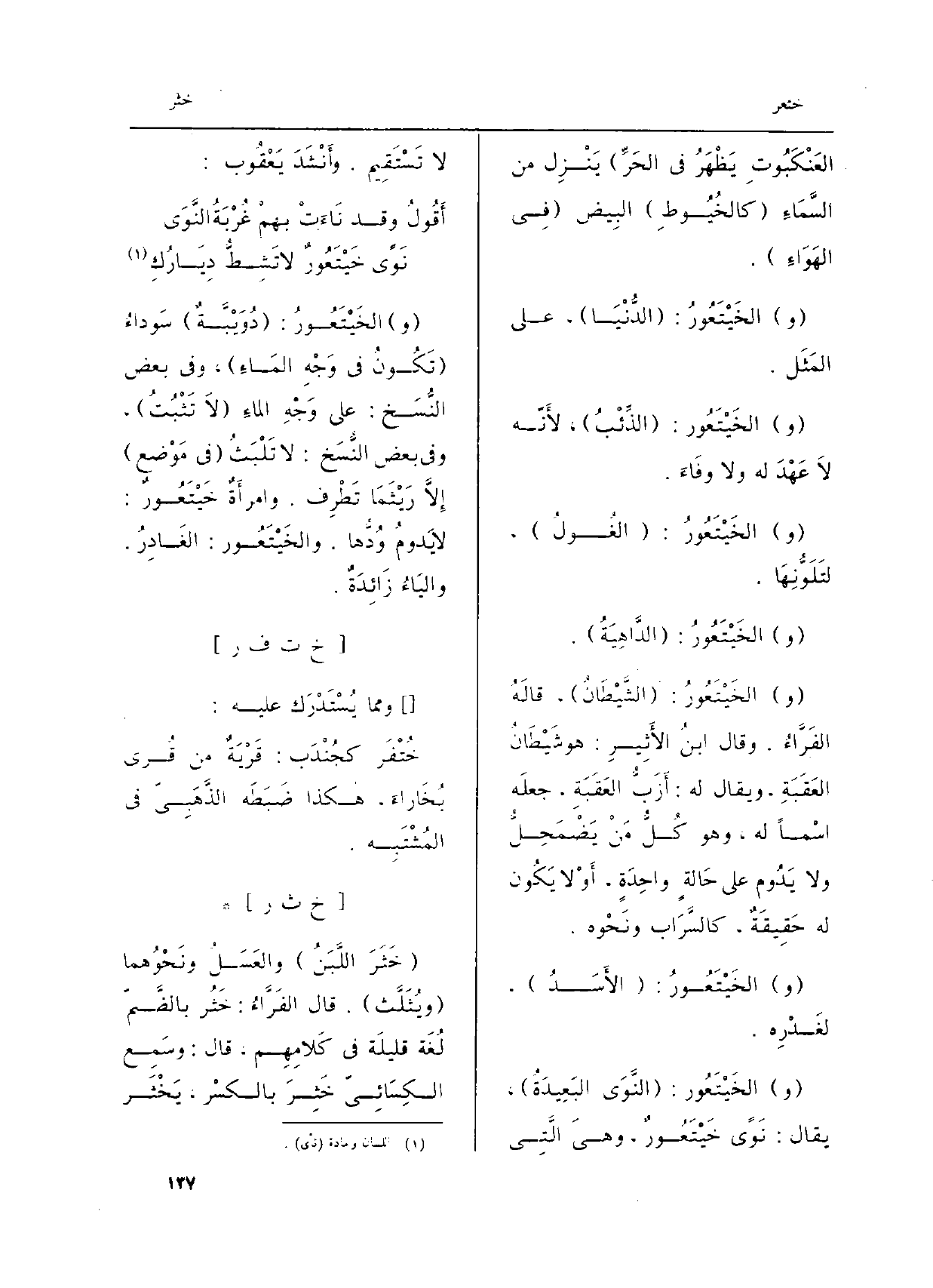 (و) الخَيْتَعُورُ: (دُوَيْبَّةٌ) سَوداءُ (تَكُونُ فِي وَجْهِ المَاءِ) ، وَفِي بعض النُّسَخ: على وَجْهِ الماءِ (لاَ تَثْبُتُ) ، وَفِي بعض النُّسَخ: لَا تَلْبَثُ (فِي مَوْضع) إِلاَّ رَيْثَمَا تَطْرِف. وامرأَةٌ خَيْتَعُورٌ: لَا يَدومُ وُدُّها. والخَيْتَعُور: الغَادِرُ. واليَاءُ زَائِدَةٌ.