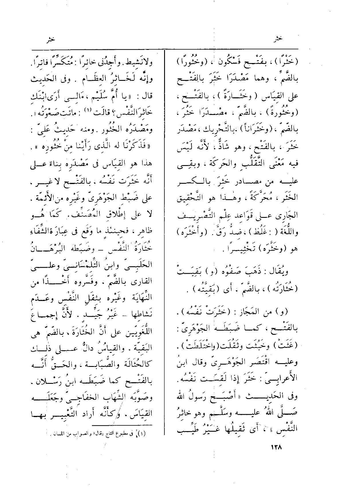(و) من المَجَاز: (خَثَرَتْ نَفْسُه) ، بالفَتْح، كَمَا ضَبَطَه الجَوْهَرِيّ: (غَثَتْ) وخَبُثَت وثَقُلَت (واخْتَلَطَتْ) ، وَعَلِيهِ اقْتَصَر الجَوْهَرِيّ وَقَالَ ابنُ الأَعرابِيّ: خَثَرَ إِذا لَقِسَت نَفْسُه. وَفِي الحَديث (أَصْبَح رَسُولُ الله صلى الله عَلَيْهِ وسلموهو خاثِرُ النَّفْسِ) ، أَي ثَقِيلُها غَيْرُ طَيِّب وَلَا نَشِيط. وأَجِدُني خائِراً: مُتَكَسِّراً فاتِراً. وإِنَّه لَخَاثِرُ العِظَام. وَفِي الحَدِيث قَالَ: (يَا أُمَّ سُلَيْم، مَالِي أَرَى ابْنَكِ خَاثِرَ النَّفْس؟ قالَت: ماتَت صَعُوَتُه) ومَصْدَرُه الخُثُور. وَمِنْه حَدِيثُ عَلِيّ: (فَذَكَرْنَا لَهُ الَّذِي رَأَيْنعا مِنْ خُثُورِه) . هاذا هُوَ القِيَاس فِي مَصْدَرِه بِناءً على أَنَّه خَثَرَت نَفْسُه، بالفَتْح لَا غَير، على ضَبْطِ الجَوْهَرِيّ وغَيْرِه من الأَئِمّة، لَا على إِطْلاقِ المُصَنِّف، كَمَا هُو ظاهِر، فحِينئذٍ مَا وَقَعَ فِي عِبَارَة الشِّفَاءِ خُثَارَةُ النَّفْس وضَبَطه البُرْهَانُ الحَلَبِيّ وابنُ التِّلِمْسَانِيّ وعليّ الْقَارِي بالضَّمّ، وفَسَّروه أَخْذاً من النِّهَايَة وغَيْره بثِقَلِ النَّفْسِ وعَدَمِ نَشاطِها غَيْرُ جَيِّدٍ، لأَنَّ إِجماعَ اللُّغَوِيّين على أَنَّ الخُثَارَةَ، بالضّمّ هِيَ البَقِيّة، والقِياسُ دالُّ على ذالك كالحُثَالَة والصُّبَابة، والحَقُّ أَنَّه بالفَتْح كَمَا ضَبَطَه ابنُ رَسْلان، وصَوَّبَه الشِّهَاب الخفَاجِيّ وجَعَلَه القِيَاسَ، وكأَنَّه أَراد التَّعْبِير بهَا