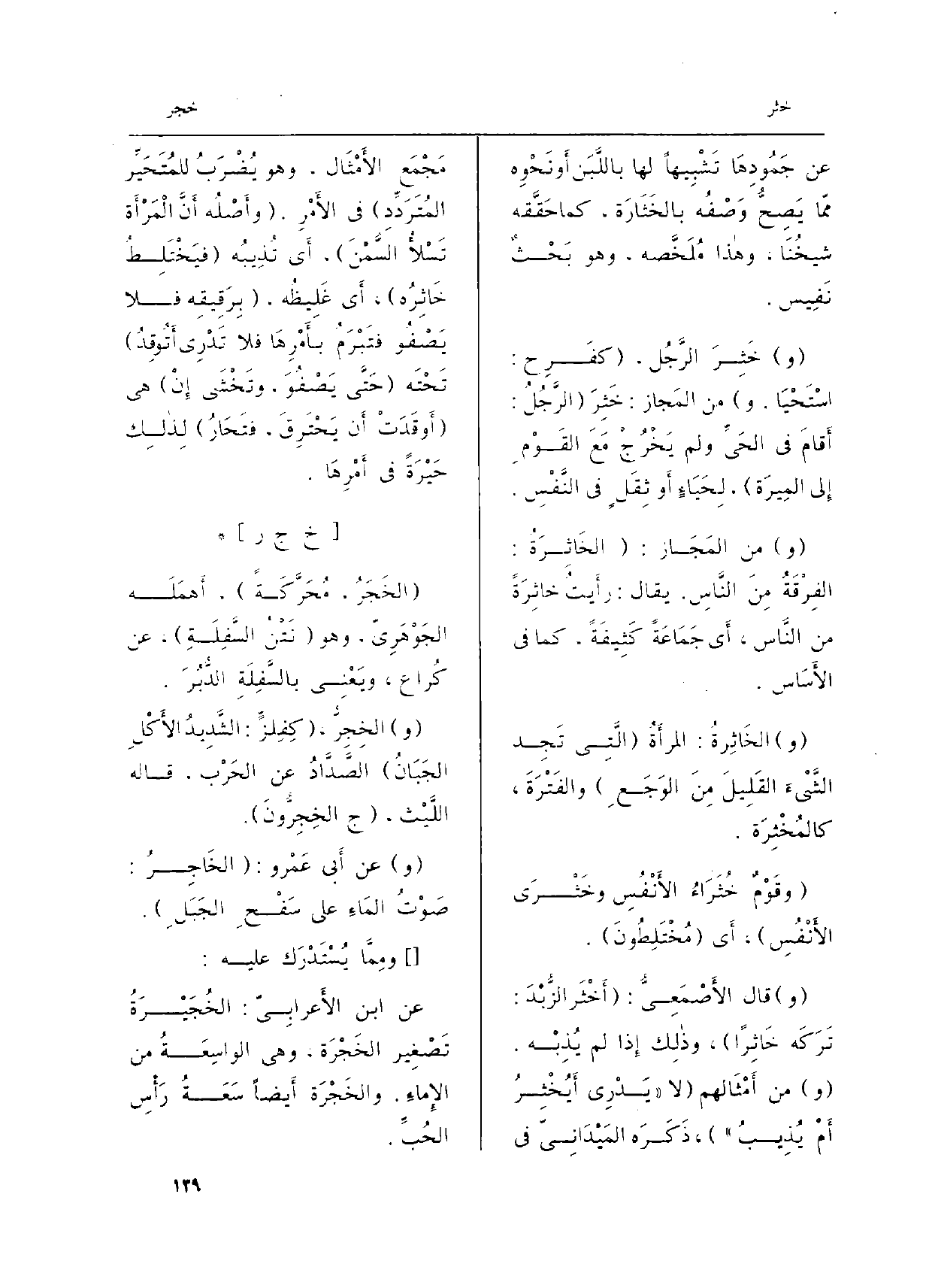 (و) قَالَ الأَصْمَعِيُّ: (أَخْثَر الزُّبْدَ: تَرَكَه خَاثِراً) ، وذالِك إِذا لم يُذِبْه. (و) من أَمْثَالهم (لَا (يَدْرِي أَيُخْثِرُ أَمْ يُذِيبُ) ، ذَكَرَه المَيْدَانِيّ فِي مَجْمَع الأَمْثَال، وَهُوَ يَضْرَبُ للمُتَحَيِّر المُتَرَدِّد) فِي الأَمْرِ. (وأَصْلُه أَنَّ الْمَرْأَة تَسْلأُ السَّمْنَ) ، أَي تُذِيبُه (فيَخْتَلِطُ خَاثِرُه) ، أَي غَلِيظُه، (بِرَقِيقِه فَلَا يَصْفُو فتَبْرَمُ بأَمْرِهَا فَلَا تَدْرِي أَتُوِقدُ) تَحْتَه (حَتَّى يَصْفُوَ، وتَخْشَى إِنْ) هِيَ (أَوقَدَتْ أَن يَحْتَرِقَ، فتَحَارُ) لِذالِك حَيْرَةً فِي أَمْرِهَا.