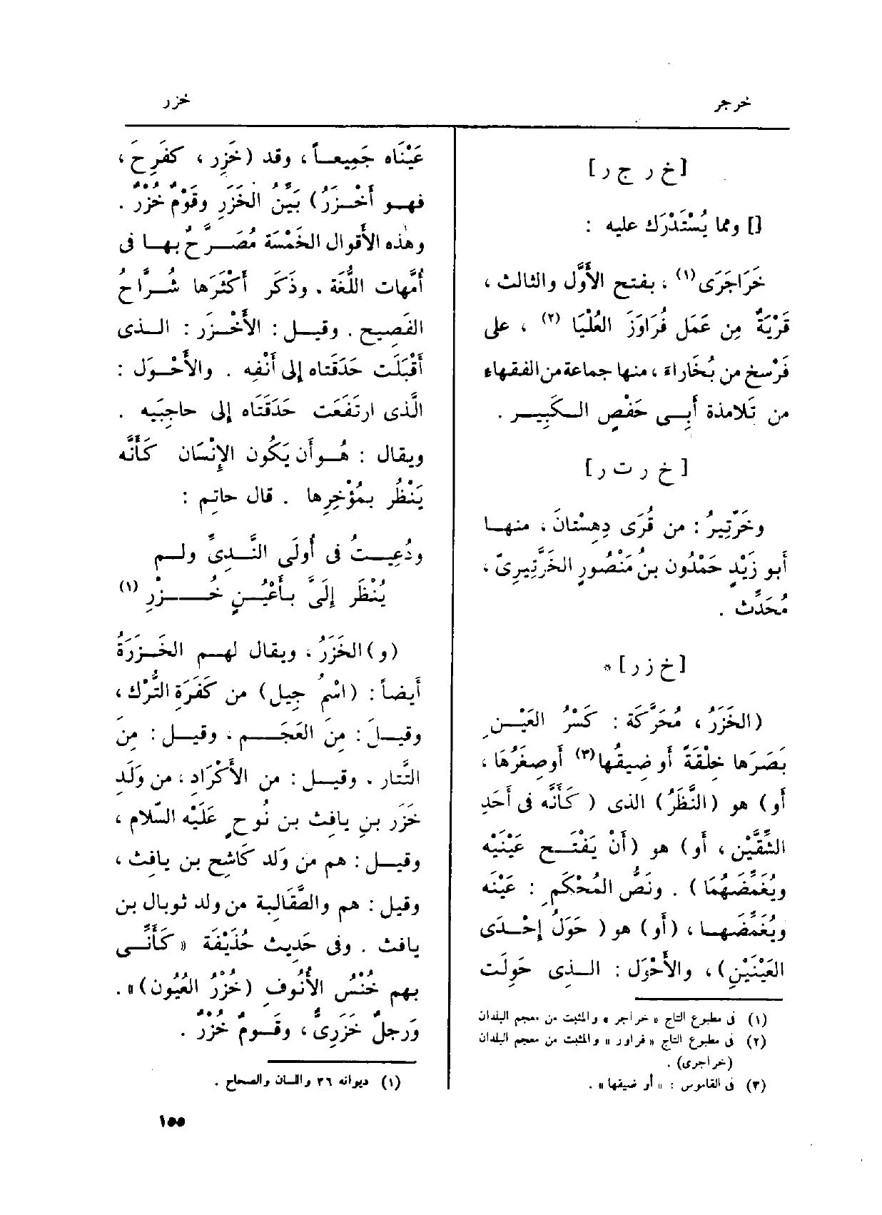 : (الخَزَرُ، مُحَرَّكَة: كَسْرُ العَيْنِ بَصَرها خِلْقَةً أَو ضِيقُها أَو صِغَرُهَا، أَو) هُوَ (النَّظَرُ) الَّذِي (كَأَنَّهُ فِي أَحَدِ الشِّقَّيْن، أَو) هُوَ (أَنْ يَفْتَح عَيْنَيْه ويُغَمِّضَهُمَا) . ونَصُّ المُحْكَمِ: عَيْنَه ويُغَمِّضَها، (أَو) هُوَ (حَوَلُ إِحْدَى العَيْنَيْنِ) ، والأَحْوَل: الذِي حَوِلَت عَيْنَاه جَمِيعاً، وَقد (خَزِر، كفَرِحَ، فَهُوَ أَخْزَرُ) بَيِّنُ الخَزَرِ وقَوْمٌ خُزْرٌ. وهاذه الأَقوال الخَمْسَة مُصَرَّحٌ بهَا فِي أُمَّهات اللُّغَة، وذَكَر أَكْثَرَها شُرَّاحُ الفَصِيح. وَقيل: الأَخْزَر: الَّذِي أَقْبَلَت حَدَقَتاه إِلى أَنْفِه. والأَحْوَل: الَّذي ارتَفَعَت حَدَقاه إِلى حاجِبَيه. وَيُقَال: هُو أَنَّ يَكُون الإِنْسَان كَأَنَّه يَنْظُر بمُؤْخِرِها. قَالَ حاتِم: