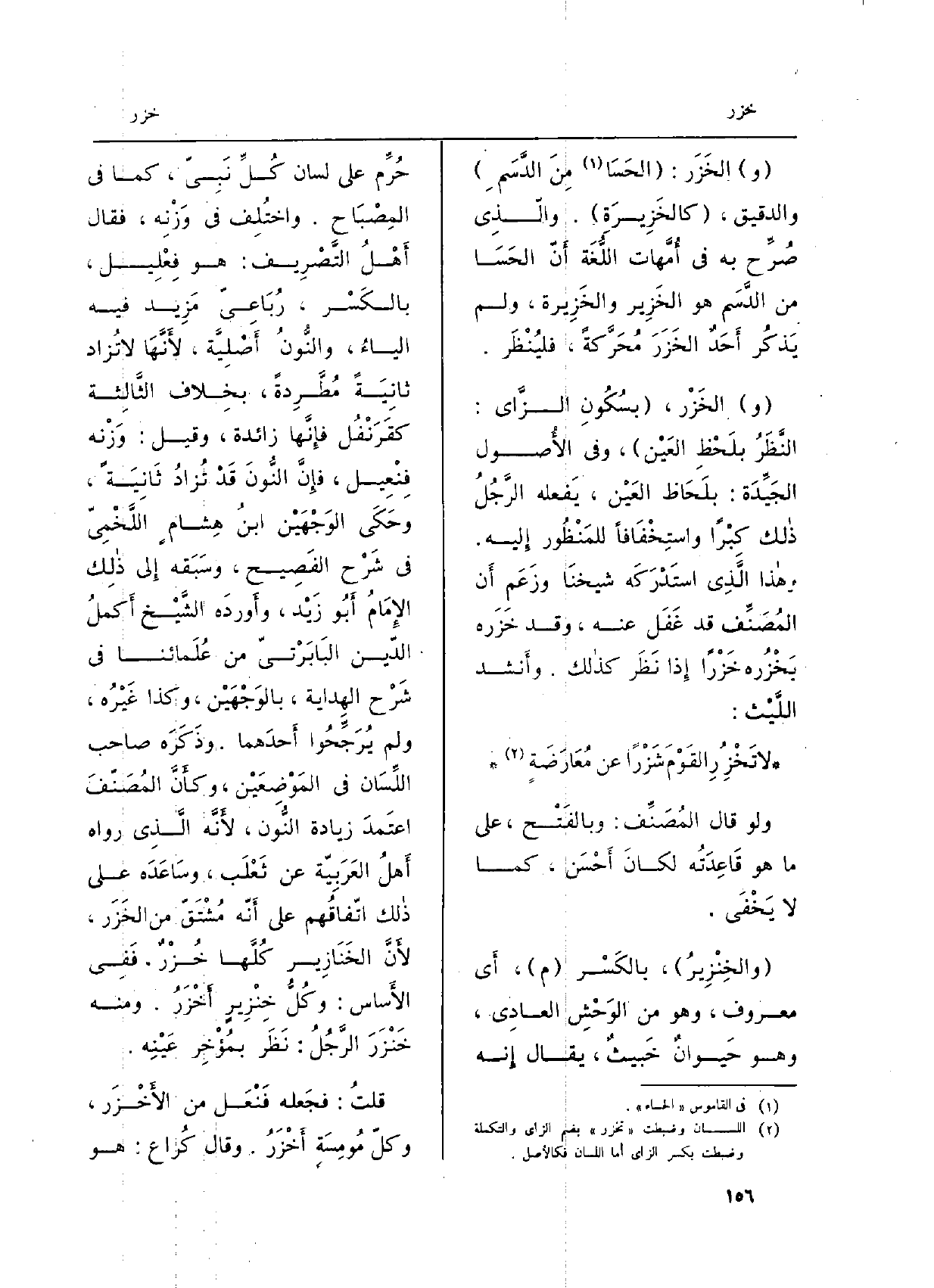 (والخِنْزِيرُ) ، بالكَسْر (م) ، أَي مَعْرُوف، وَهُوَ من الوَحْشِ العادِي، وَهُوَ حَيوانٌ خَبيثٌ، يُقَال إِنه حُرِّم على لِسَان كُلِّ نَبِيّ، كَمَا فِي المِصْباح. واختِلَف فِي وَزْنِه، فَقَالَ أَهْل التَّصْرِيف: هُوَ فِعْلِيل، بالكَسْر، رُبَاعِيّ مَزِيد فِيهِ الياءُ، والنُّون أَصْلِيَّة، لأَنَّهَا لَا تُزاد ثانِيَةً مُطَّرِدةً، بخِلاف الثَّالِثَة كقَرَنْفُل فإِنَّها زَائِدَة، وَقيل: وَزْنه فِنْعِيل، فإِنَّ النُّونَ قَدْ تُزادُ ثَانِيَةً، وحَكَى الوَجْهَيْن ابنُ هِشامٍ اللَّخْمِيّ فِي شَرْح الفَصِيح، وسَبَقه إِلى ذالِك الإِمًّمُ أَبُو زَيْد، وأَوردَه الشَّيْخ أَكملُ الدّين البَابَرْتيّ من عُلَمائنا فِي شَرْح الهِداية، بالوَجْهَيْن، وَكَذَا غَيْرُه، وَلم يُرَجِّحُوا أَحدَهما. وذَكَرَه صَاحب اللِّسَان فِي المَوْضِعَيْن، وكأَنَّ المُصَنّفَ اعتَمدَ زِيَادَة النُّون، لأَنَّ الَّذِي رَوَاهُ أَهلُ العَرَبِيّة عَن ثَعْلَب، وسَاعَدَه على ذالك اتّفاقُهم على أَنّه مُشْتَقّ من الخَزَر، لأَنَّ الخَنَازِير كُلَّها خُزُرٌ، فَفِي الأَساس: وكُلُّ خِنْزِيرٍ أَخْزَرُ. وَمِنْه خَنْزَرَ الرَّجُلُ: نَظَر بمُؤْخِر عَيْنِه.