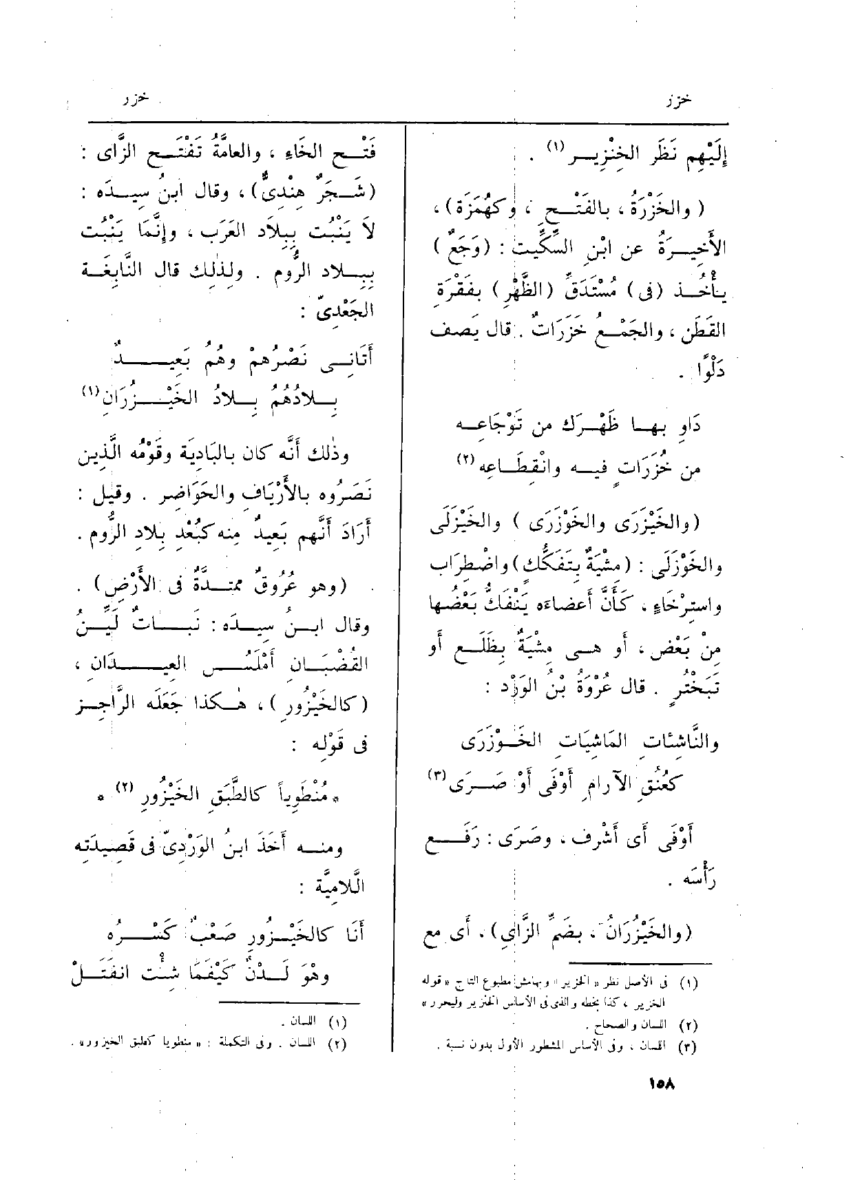 (والخَيْزُرَانُ، بضَمِّ الزَّايِ) ، أَي مَعَ فَتْح الخَاءِ، والعامَّةُ تَفْتَح الزَّاي: (شَجَرٌ هِنْدِيٌّ) ، وَقَالَ ابنُ سِيدَه: لاَ يَنْبُت بِبِلاَد العَرَب، وإِنَّمَا يَنْبُت بِبِلاد الرُّوم. ولِذالِك قَالَ النَّابِغَة الجَعْدِيّ: