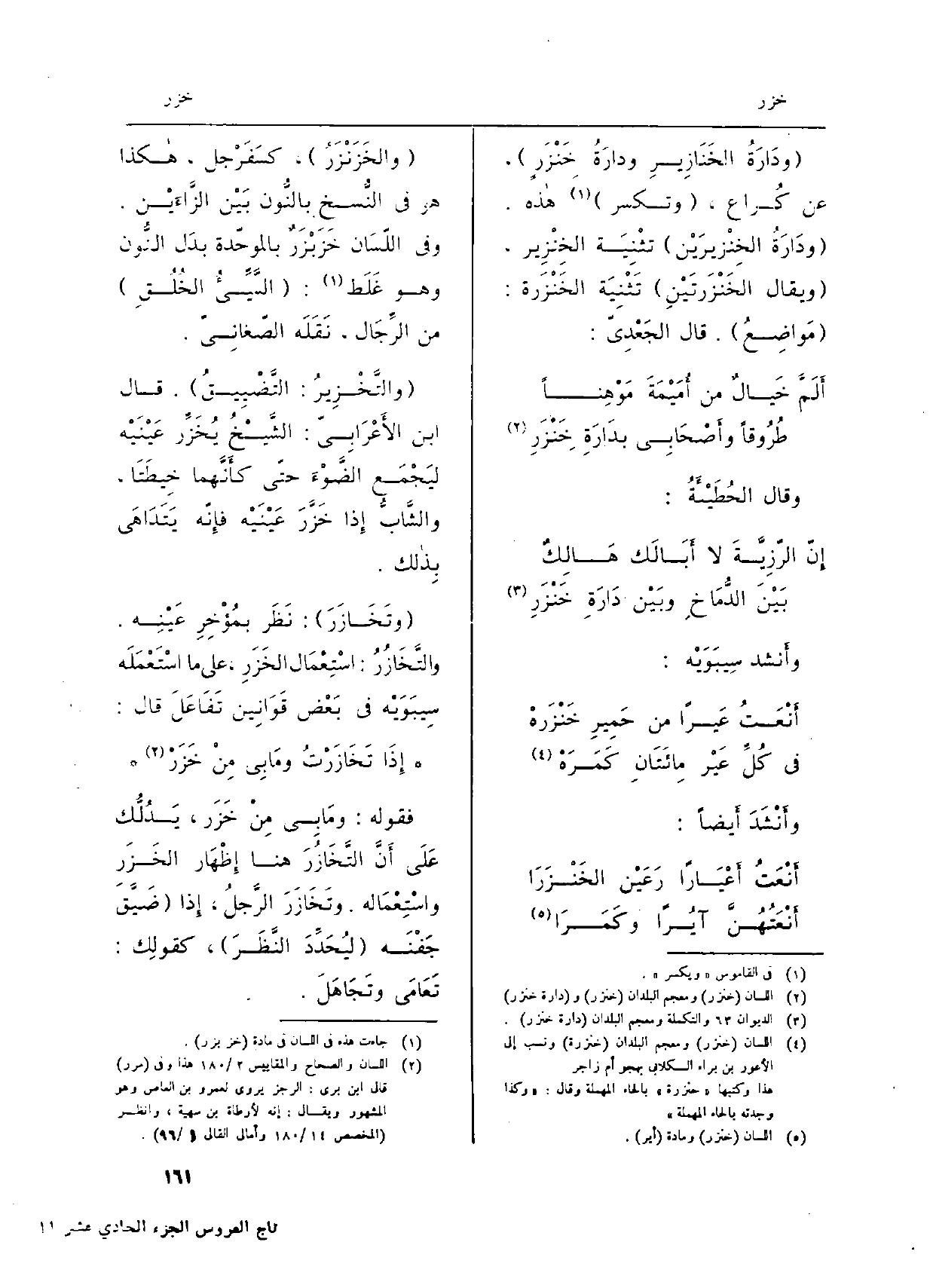 فَقَوله: وَمَا بِي مِنْ خَزَر، يَدُلُّك عَلَى أَنَّ التَّخَازُرَ هُنَا إِظْهَار الخَزَر واسْتِعْمَاله. وَتَخَازَرَ الرَّجلُ، إِذا (ضَيَّقَ) جَفْنَه (ليُحَدِّدَ النَّظَرَ) ، كقولِك: تَعَامَى وتَجَاهَلَ.