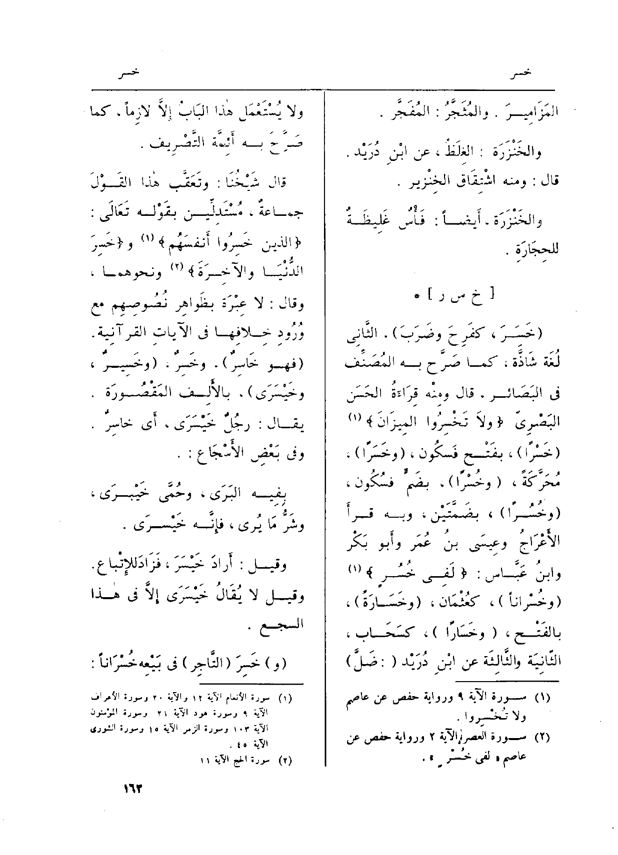 : (خَسَِرَ، كفَرِحَ وضَرَبَ) ، الثَّاني لُغة شَاذَّة، كَمَا صَرْ بِهِ المُصَنِّف فِي البَصَائر، قَالَ ومِنْه قِرَاءَةُ الحَسَن البَصْرِيّ {وَلاَ تُخْسِرُواْ الْمِيزَانَ} (: 9) (خَسْراً) ، بفَتْح فَسكُون، (وخَسَراً) ، مُحَرَّكَةً، (وخُسْراً) ، بضَمَ فسُكُون، (وخُسُراً) ، بضَمَّتَيْن، وَبِه قرأَ الأَعْرَاجُ وعِيسَى بنُ عُمَر وأَبو بَكْر وابنُ عَبَّاس: {لَفِى خُسْرٍ} (الْعَصْر: 2) (وخُسْراناً) ، كعُثْمَان، (وخَسَارةً) ، بالفَتْح، (وخَسَاراً) ، كسَحَابٍ، الثّانِيَة والثَّالِثَة عَن ابْنِ دُرَيْد (: ضَلَّ) وَلَا يُسْتَعْمَل هاذا البَابُ إِلاَّ لازِماً، كَمَا صَر 2 بِهِ أَئِمَّة التَّصْرِيف.