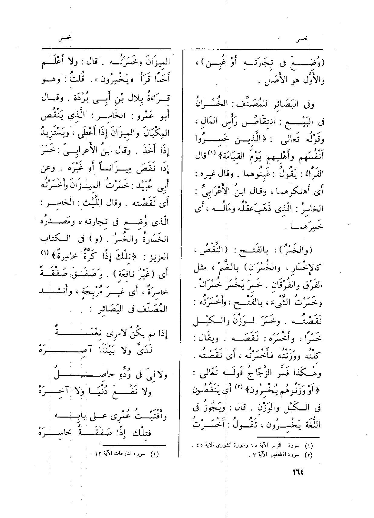 وَفِي البَصَائِر للمُصَنِّف: الخُسْرانُ فِي البَيْع: انتِقَاصُ رَأْ المَالِ، وقَوْلُه تَعالى: {الَّذِينَ خَسِرُواْ أَنفُسَهُمْ وَأَهْلِيهِمْ يَوْمَ الْقِيَامَةِ} (الزمر: 15 والشورى: 45) قَالَ الفَرَّاءُ: يَقُولُ: غَبِنُوهما. وَقَالَ غَيره: أَي أَهلكوهما، وَقَالَ ابنُ الأَعْرَابِيِّ: الخاسِرُ: الّذِي ذَهَبَ عَقْلُه ومَالُه، أَي خَسِرَهما.