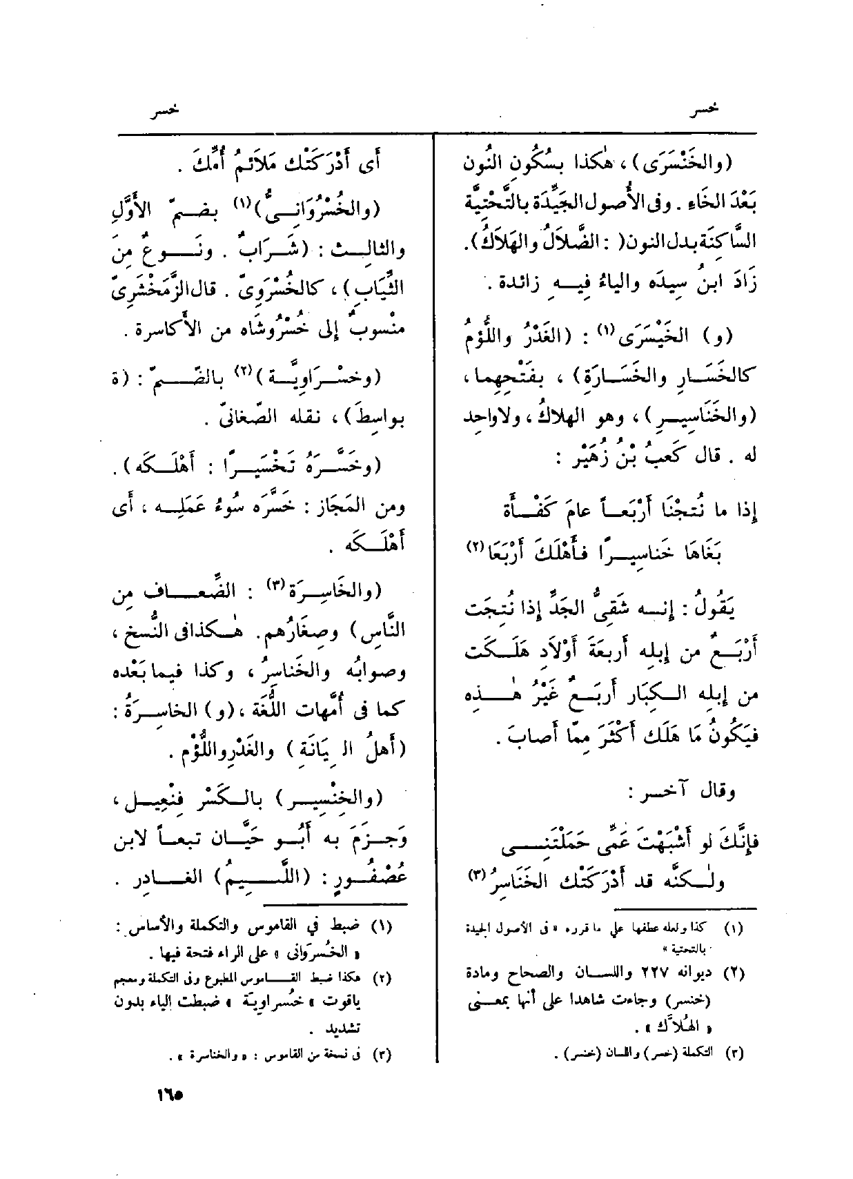 (و) الخَيْسَرَى: (الغَدْرُ واللُّؤمُ كالخَسَارِ والخَسَارَةِ) ، بفَتْحِهِما، (والخَنَاسِيرِ) ، وَهُوَ الهلاكُ، وَلَا واحِد لَهُ. قَالَ كعبُ بنُ زُهَيْر: