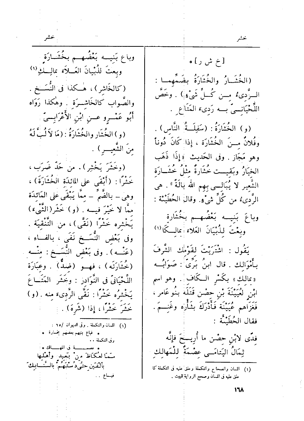 (و) الخُشَار والخُشَارَةُ: (مَا لاَ لُبَّ لَهُ مِنَ الشَّعِيرِ) .