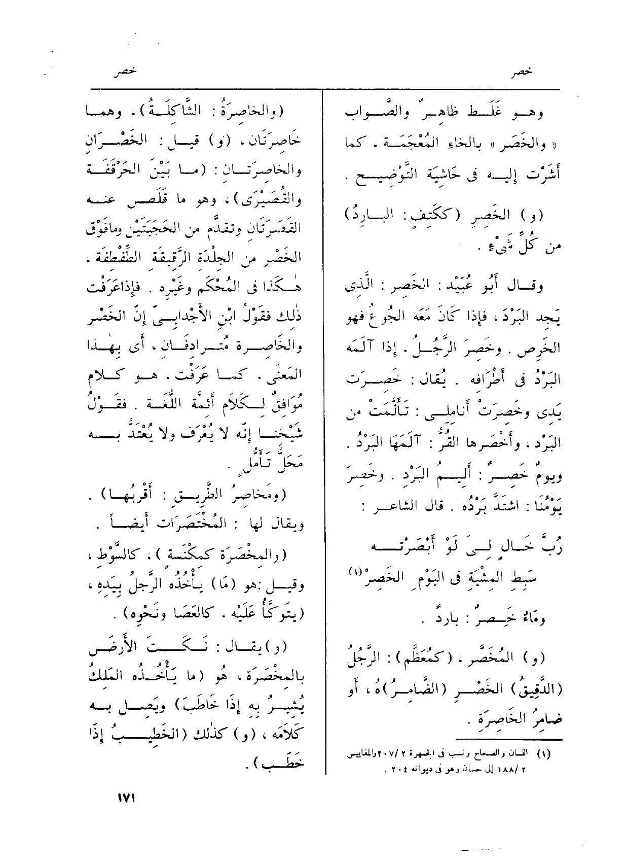 (والخاصِرَةُ: الشَّاكِلَةُ) ، وهما خَاصِرَتَان، (و) قيل: الخَصْرَانِ والخاصِرَتانِ: (مَا بَيْنَ الحَرْقَفَة والقُصَيْرَى) ، وَهُوَ مَا قَلَص عَنهُ القَصَرتَانِ وتقدَّم من الحَجَبَتَيْن وَمَا فَوْق الخَصْر من الجِلْدَةِ الرَّقِيقَةِ الطِّفْطِفَة، هاكَذا فِي المُحْكَم وغَيْرِه. فإِذا عَرَفْت ذالك فقَوْلُ ابْنِ الأَجْدابِيّ إِنّ الخَصْر والخَاصِرَة مُترادِفَانِ، أَي بِهاذا المَعَنى، كَمَا عَرَفْت، هُوَ كَلَام مُوَافِقٌ لِكَلاَم أَئِمَّة اللُّغَة. فقَوْلُ شَيْخِنا إِنّه لَا يُعْرَف وَلَا يُعْتَدُّ بِهِ مَحَلُّ تَأَمُّلٍ.