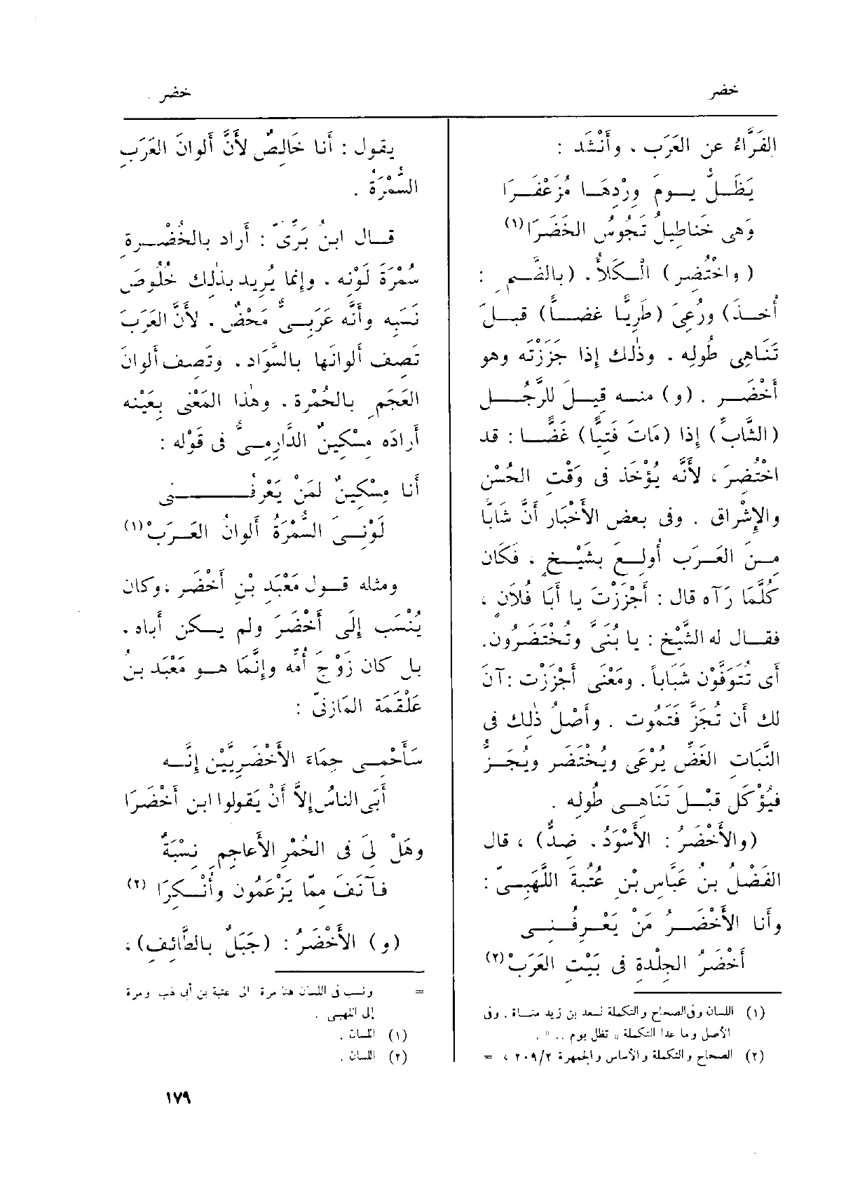 قَالَ ابنُ بَرِّيّ: أَراد بالخُضْرَةِ سُمْرَةَ لَوْنِه، وإِنما يُرِيد بذالِك خُلُوصَ نَسَبِه وأَنَّه عَرَبِيٌّ مَحْضٌ، لأَنَّ العَرَبَ تَصِف أَلوانَها بالسَّوَاد، وتَصِف أَلوانَ العَجَمِ بالحُمْرَة، وهاذا المَعْنى بِعَيْنه أَرادَه مِسْكِينٌ الدَّارِمِيُّ فِي قَوْله: