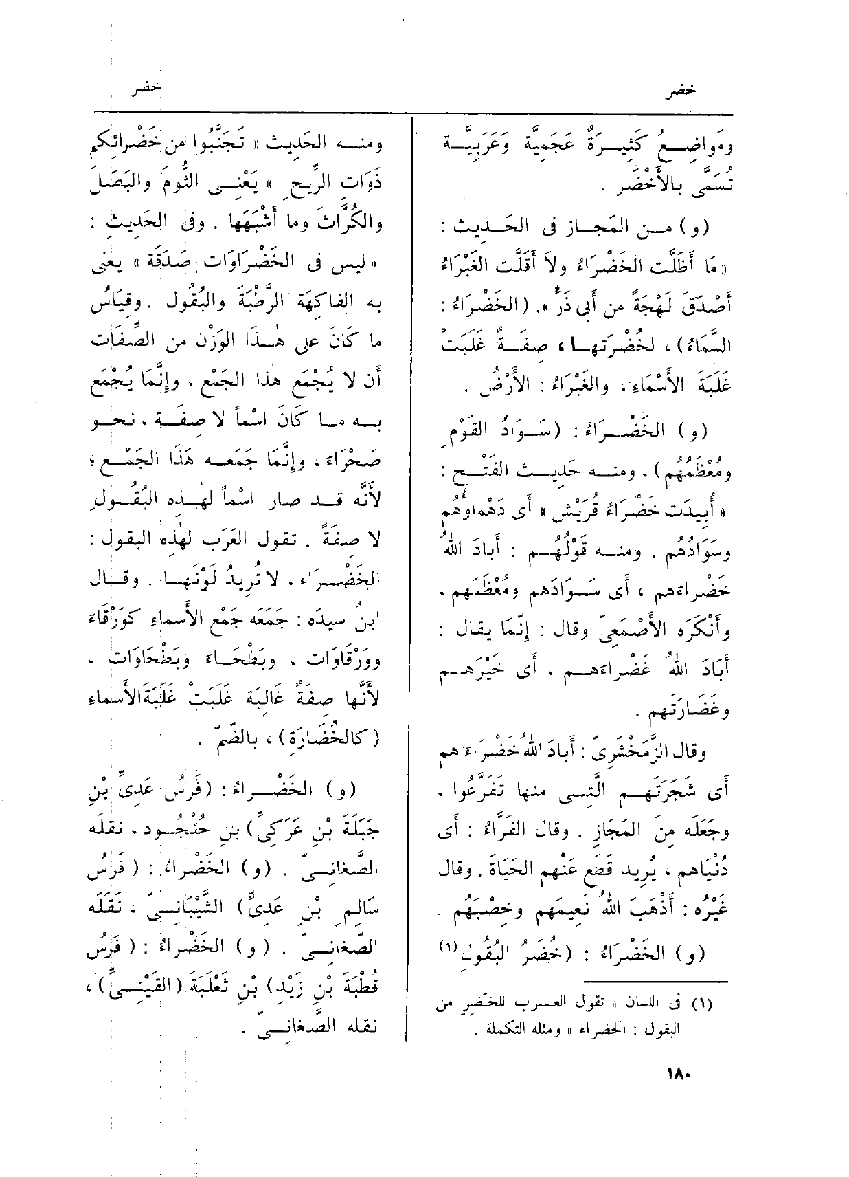 (و) الخَضْرَاءُ: (خُضَرُ البُقُولِ) وَمِنْه الحَديث: (تَجَنَّبُوا من خَضْرَائِكِم ذَوَات الرِّيحِ) يَعْنِي الثُّومَ والبَصَل والكُرَّاثَ وَمَا أَشْبَهها. وَفِي الحَدِيث: (لَيْسَ فِي الخَضْرَاوَات صَدَقَة) يَعْنِي بِهِ الفاكِهَة الرَّطْبَةَ والبُقُول. وقِيَاسُ مَا كَانَ على هاذا الوَزْن من الصِّفَات أَن لَا يُجْمَع هاذا الجَمْع، وإِنَّمَا يُجْمَع بِهِ مَا كَانَ اسْماً لَا صِفَة، نَحْو صَحْرَاءَ، وإِنَّمَا جَمَعه هَذَا الجَمْع؛ لأَنَّه قد صَار اسْما لهاذه البُقُولِ لَا صِفَةً. تَقول العَرَب لهاذِ الْبُقُول: الخَضْرَاء، لَا تُرِيدُ لَوْنَها. وَقَالَ ابنُ سيدَه: جَمَعَه جَمْع الأَسماءِ كوَرْقَاءَ ووَرْقَاوَات، وبَطْحَاءَ وبَطْحَاوَات، لأَنَّها صِفَةٌ غَالِبَة غَلَبَتْ غَلَبَةَ الأَسماءِ (كالخُضَارَةِ) ، بالضّمّ.