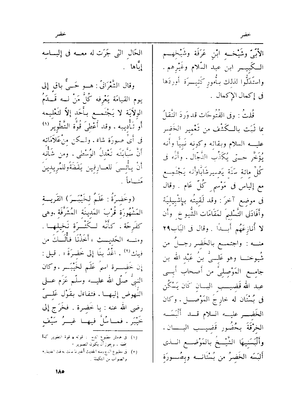 قُلتُ: وَفِي الفُتُوحَات قد وَردَ النَّقلُ بِمَا ثَبَت بالكَشْف من تَعْمِير الخَضِر عَلَيْهِ السَّلَام وبقائِه وكونِه نَبِيًّا وأَنه يُؤَخَّر حَتَّى يُكَذِّب الدَّجّال، وأَنَّه فِي كُلِّ مِائةِ سَنَةٍ يَصِير شَابًّا وأَنه يَجْتَمِع مَعَ إِلياس فِي مَوْسمِ كُلّ عَام. وَقَالَ فِي موضِع آخرَ: وَقد لَقِيتُه بإِشْبِيلِيَة وأَفَادَني التَّسْلِيمَ لمَقَامَات الشُّيوخِ وأَن لَا أُنازِعَهُم أَبداً. وَقَالَ فِي البَاب 29 مِنْهُ: وَاجْتمعَ بالخَضِر رجلٌ من شُيوخنا وَهُوَ عَلِيُّ بنُ عَبْدِ الله بن جامِع المَوْصِلِيُّ من أَصْحَاب أَبِي عبد الله قَضِيبِ البانِ كَان يَسْكُن فِي بُسْتَان لَهُ خارِجَ المَوْصل، وَكَانَ الخَضِر عَلَيْهِ السَّلَام قد أَلْبَسَه الخِرْقَةَ بحُضُور قَضِيب البان، وأَلْبَسَنِيهَا الشَّيْخُ بالمَوْضع الَّذِي أَلَبَسه الخَضِرُ من بُسْتَانه وبِصُورَةِ الْالِ الَّتِي جَرَت لَهُ مَعَه فِي إِلباسِه إِيَّاها.