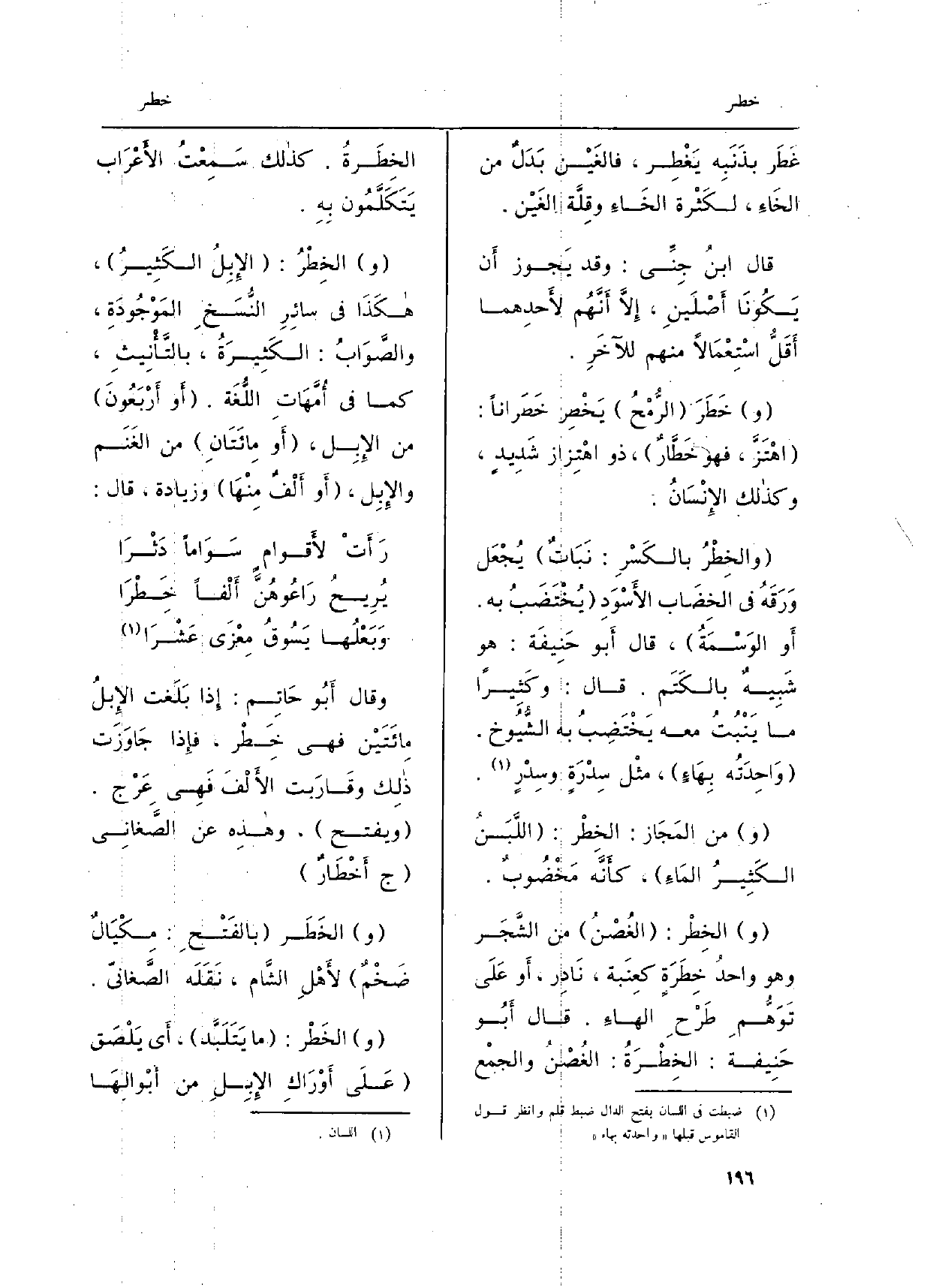 وَقَالَ أَبُو حَاتِم: إِذا بَلَغت الإِبلُ مائَتَيْن فَهِيَ خِطْر، فإِذا جَاوَزَت ذالك وقَارَبت الأَلْفَ فَهِي. عَرْج. (وَيفتح) ، وهاذِه عَن الصَّغاني (ج أَخْطَارٌ) .