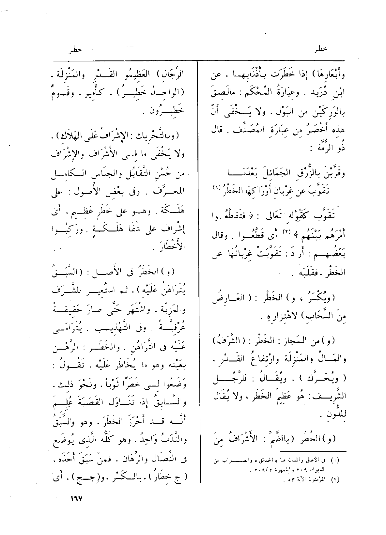 (و) الخُطُر (بالضَّمِّ: الأَشْرَافُ مِنَ الرِّجَالِ) العَظِيمُو القَدْرِ والمَنْزِلَة، (الواحِدُ خَطِيرٌ) ، كأَمِير، وقَومٌ خَطِيرُون.