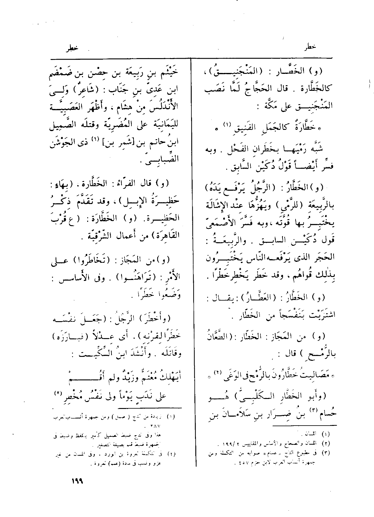 (و) الخَطَّارُ: (الرَّجُلُ يَرْفَع يَدَهُ) بالرَّبِيعَةِ (للرَّمْيِ) ويَهُزُّهَا عِنْد الإِشَالَة يخْتَبِرُ بهَا قُوَّتَه، وَبِه فَسَّر الأَصْمَعِيّ قَول دُكَيْن السَّابِق. والرَّبِيعَةُ: الحَجَر الَّذِي يَرْفَعه النّاس يَخْتَبِرُون بِذالِك قُواهُم، وَقد خَطَرَ يَخْطِر خَطْراً.
