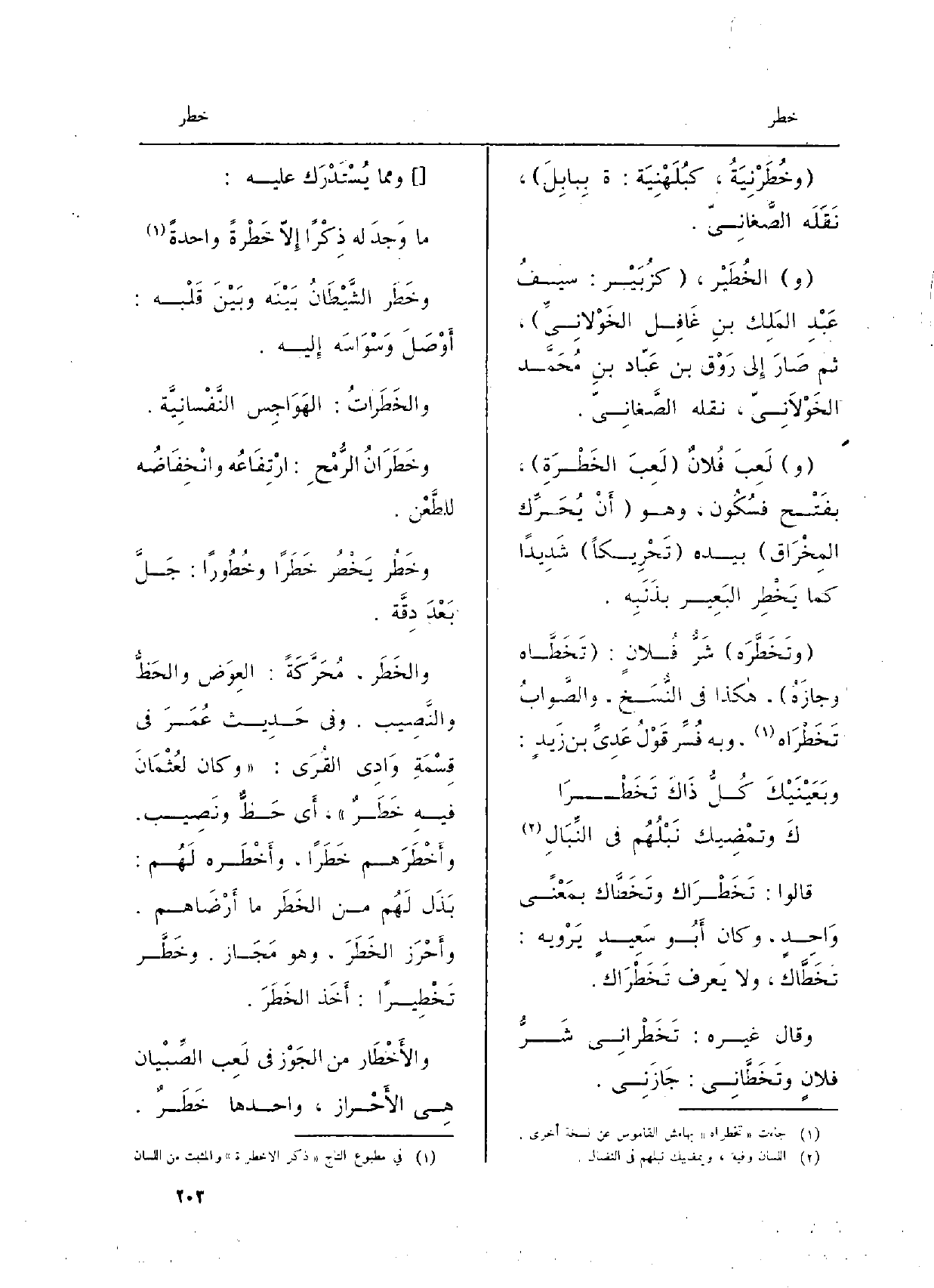 والخَطَر، مُحَرَّكَةً: العِوَض والحَظُّ والنَّصِيب. وَفِي حَدِيث عُمَرَ فِي قِسْمَةِ وَادِي القُرَى: (وَكَانَ لعُثْمَانَ فيهِ خَطَرٌ) ، أَيب حَظٌّ ونَصِيب. وأَخْطَرَهم خَطَرَاً، وأَخْطَره لَهُم: بَذَل لَهُم من الخَطَر مَا أَرْضَاهم. وأَحْرَز الخَطَرَ، وَهُوَ مَجَاز. وخَطَّر تَخْطِيراً: أَخَذ الخَطَر.