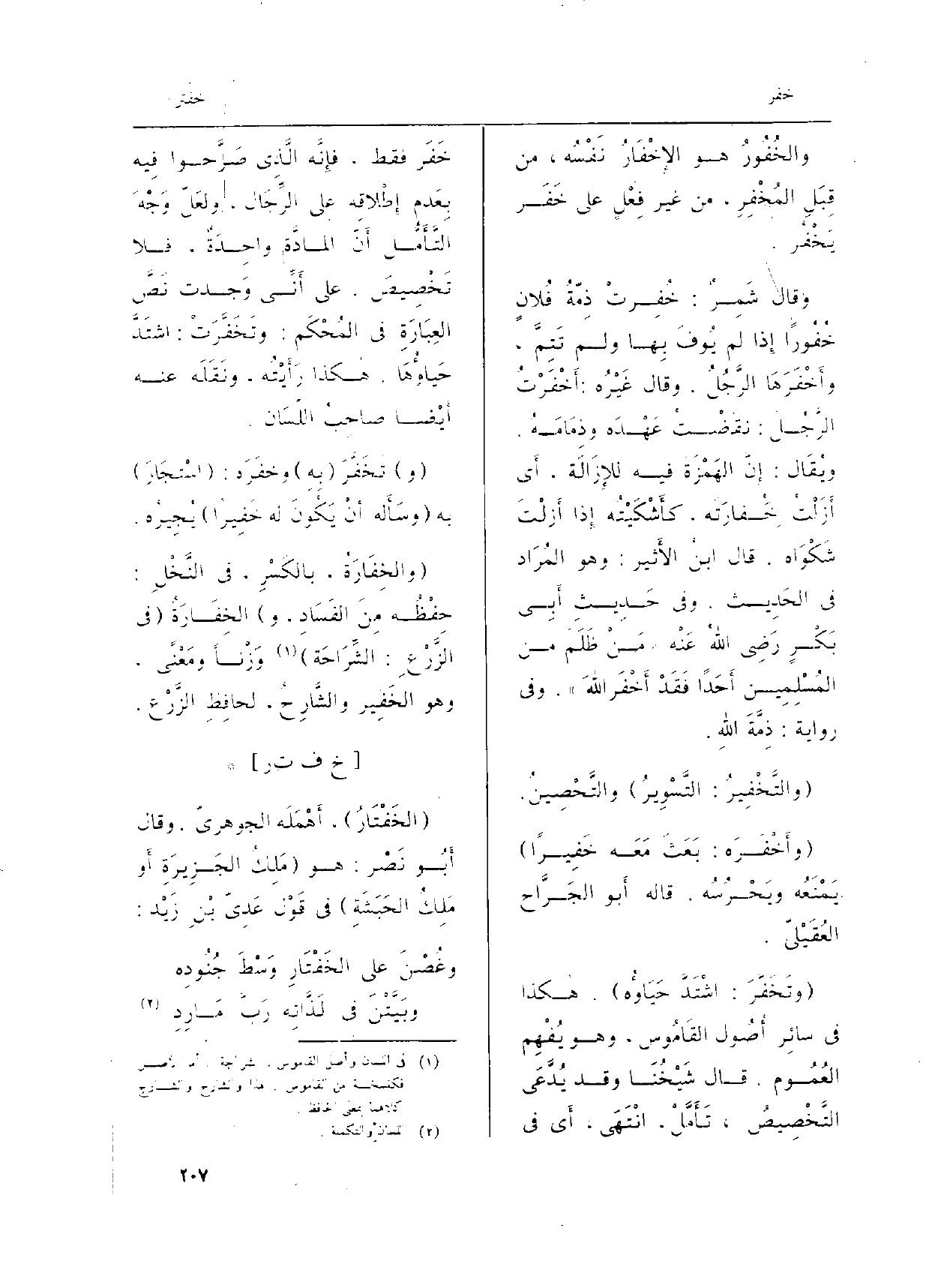 وَقَالَ شَمِرٌ: خُفِرَتْ ذِمّةُ فُلانٍ خُفُوراً إِذا لم يُوفَ بهِا وَلم تَتِمَّ، وأَخْفَرَهَا الرَّجُلُ. وَقَالَ غَيْرُه: أَخْفَرْتُ الرَّجُلَ: نَقَضْتُ عَهْدَه وذِمَامَهُ. ويُقَال: إِنَّ الهَمْزَةَ فِيهِ للإِزَالَة، أَي أَزَلْتُ خَِفارَتَه، كأَشْكَيْتُه إِذا أَزلْتَ شَكْوَاه. قَالَ ابنُ الأَثير: وَهُوَ المُرَاد فِي الحَدِيث. وَفِي حَدِيثِ أَبِي بَكْرٍ رَضِي اللَّهُ عَنْه (مَنْ ظَلَمَ من المُسْلِمِين أَحَداً فَقَدْ أَخْفَرَ اللَّهَ) . وَفِي رِوَايَة: ذِمَّةَ اللَّهِ.