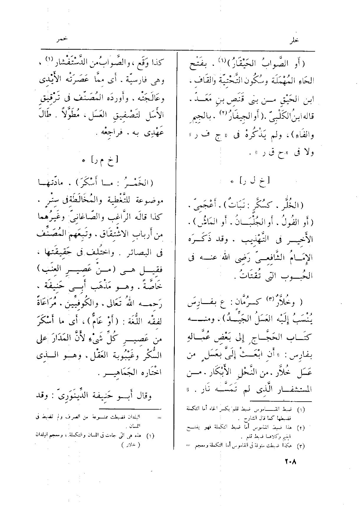 : (الخَمْرُ: مَا أَسْكَرَ) ، مادّتها مَوْضُوعَة للتَّغْطِية والمُخَالطَةَ فِي سِتْرٍ، كَذَا قالَه الرَّاغِب والصّاغانِيّ وغَيرُهما من أَربابِ الاشْتِقَاق، وتَبِعَهم المُصَنِّف فِي البصائر. واختُلِف فِي حَقِيقَتَها، فقِيل هِيَ (من عَصِيرِ العَنْب) خَاصَّةً، وَهُوَ مَذْهَب أَبِي حَنِيفَة، رَحِمه اللَّهُ تَعَالى، والكُوفِيِّين، مُرَاعَاةً لفِقْه اللُّغَة: (أَوْ عَامٌّ) ، أَي مَا أَسْكَرَ من عَهيرِ كُلِّ شَيْءٍ لأَنَّ المَدَارَ على السُّكْر وغَيْبُوة العَقْل، وَهُوَ الذِي اخْتَاره الجَمَاهِير.