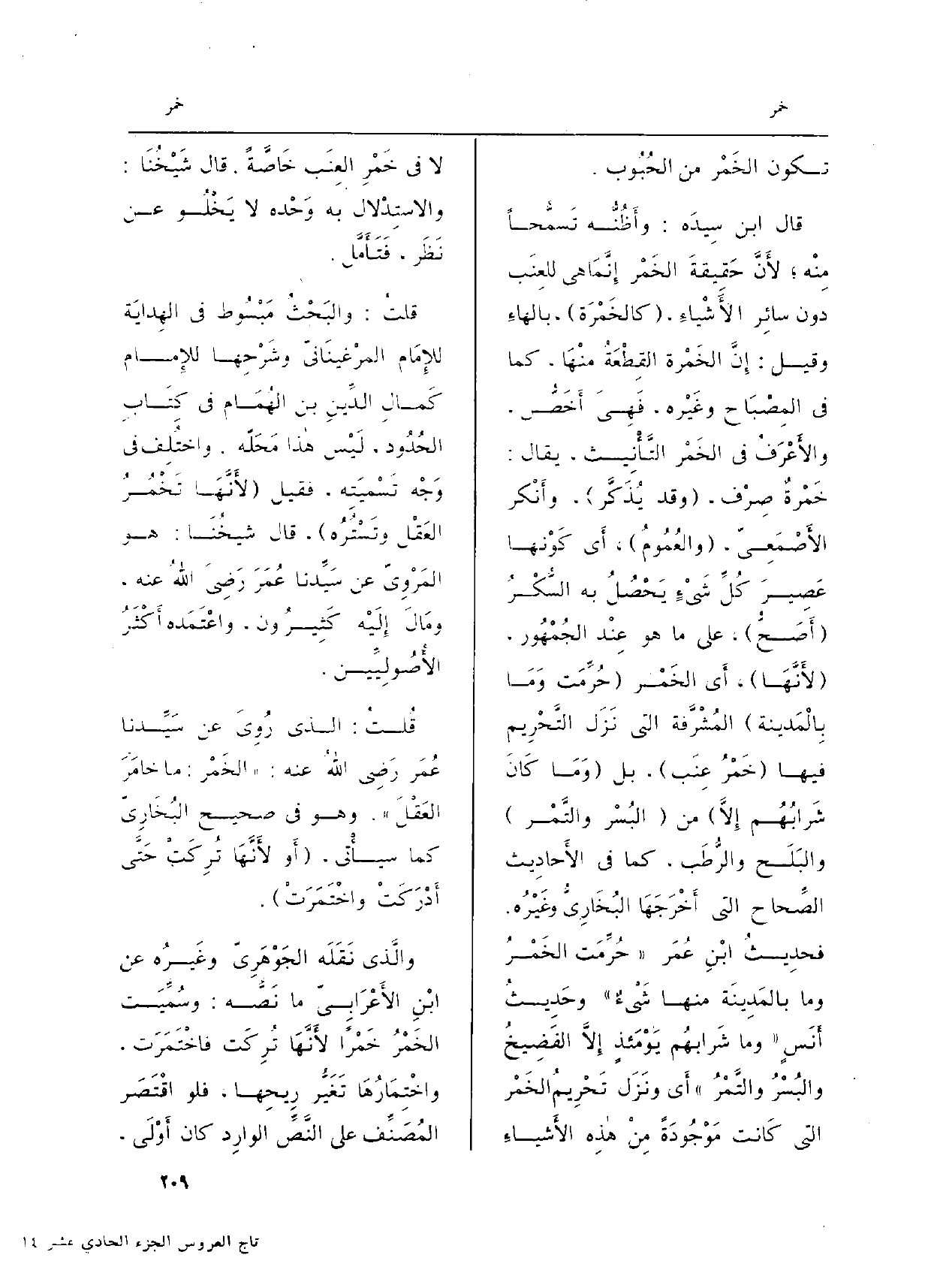 قلتُ: والبَحْثُ مَبْسُوط فِي الهِدايَة للإِمَام المرْغينَانيّ وشَرْحِها للإِمام كَمالِ الدِّينِ بن الهُمَام فِي كِتَابِ الحُدُود، لَيْس هاذا مَحَلّه. واختِلِف فِي وَجْه تَسْمِيتَه، فَقيل (لأَنَّهَا تَخْمُرُ العَقْل وتَسْتُرُه) ، قَالَ شيخُنَا: هُوَ المَرْوِيّ عَن سَيِّدنا عُمَرَ رَضِي اللَّهُ عَنهُ، ومَالَ إِلَيْه كَثِيرُون، واعْتَمَده أَكْثَرُ الأُصُولِيِّين.
