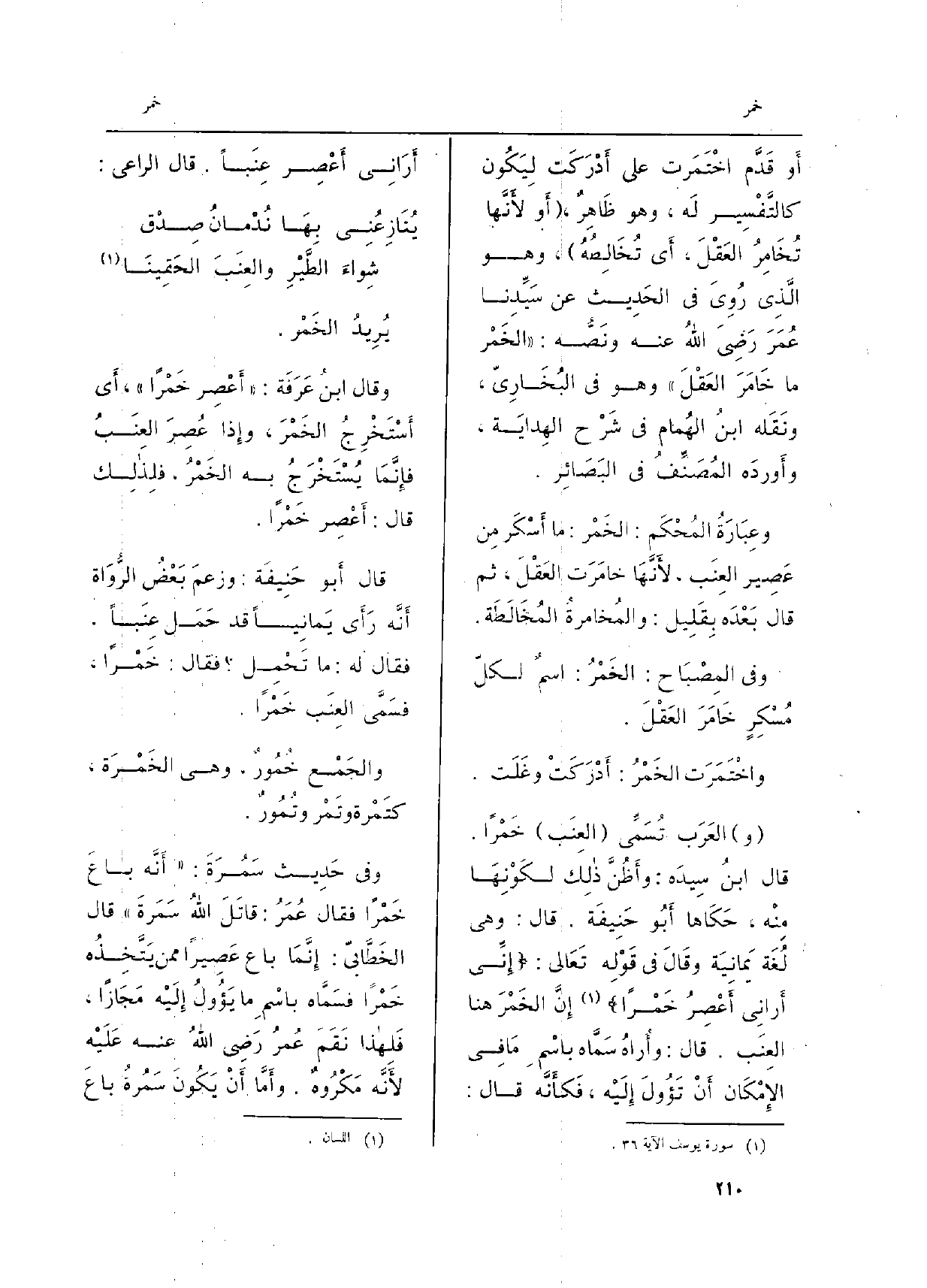 (و) العَرَب تُسَمِّى (العِنَب) خَمْراً. قَالَ ابنُ سِيدَه: وأَظُنَّ ذالِك لكَوْنِهَا مِنْه، حَكَاهَا أَبُو حَنِيفَة. قَالَ: وَهِي لُغَة يَمانِيَة وقَالَ فِي قَوْلِه تَعَالى: {) 1 (. 013 إِنِّي اءَراني أعصر خمرًا} (يُوسُف: 36) إِنَّ الخَمْرَ هُنَا العِنَب. قَالَ: وأُراهُ سَمَّاه باسْمِ مَا فِي الإِمْكَان أَنْ تَؤُولَ إِلَيْه، فكَأَنَّه قَالَ: أَرَانِي أَعْصِر عِنَباً. قَالَ الرَّاعِي: