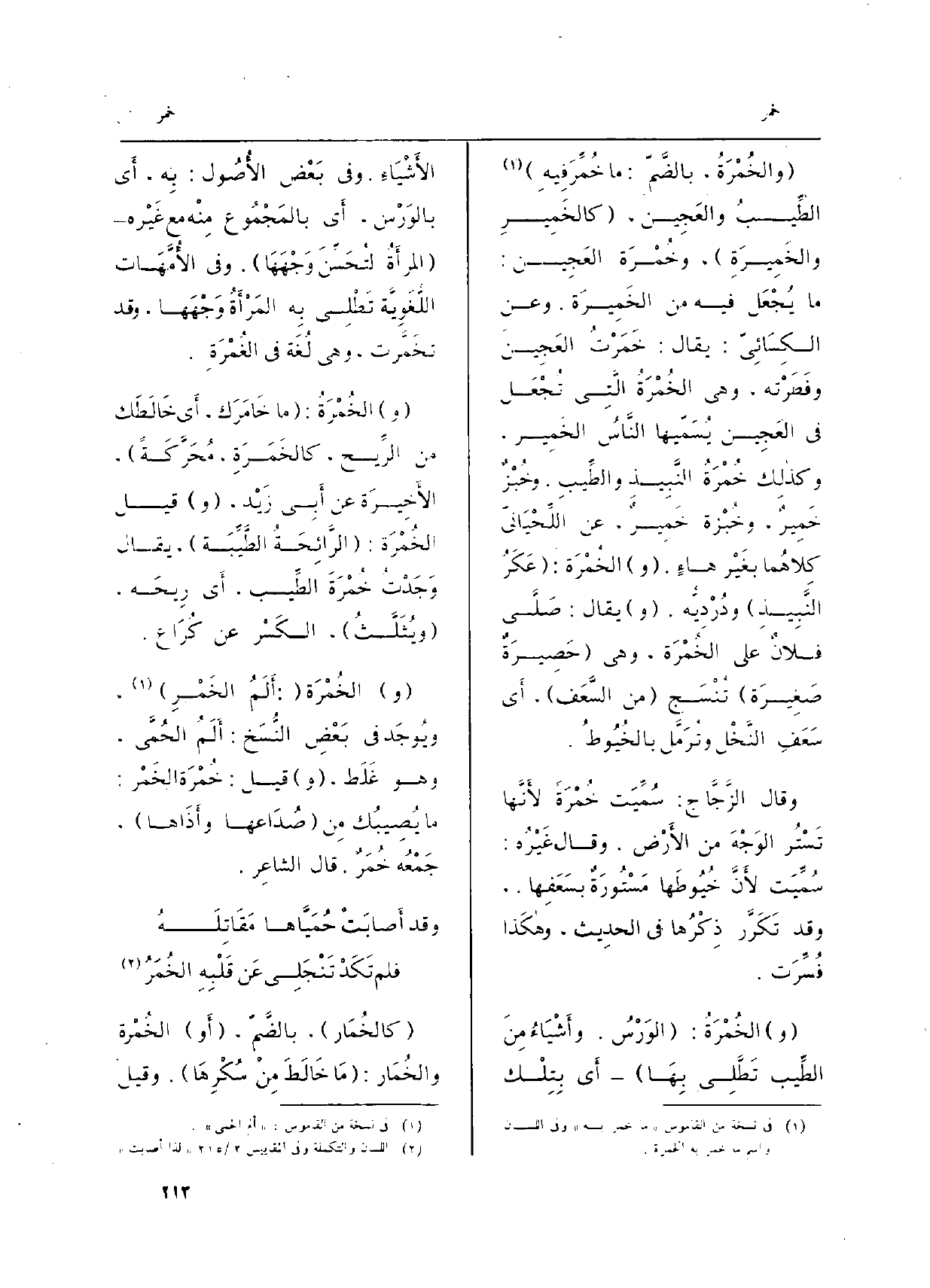 (والخْمْرَةُ، بالضَّمّ: مَا خُمِّرَ فِيهِ) الطِّيبُ والعَجِين، (كالخَمِيرِ والخَمِيرَةِ) ، وحُمْرَة العَجِين: مَا يُجْعَل فِيهِ من الخَمِيرَة. وَعَن الكِسَائِيّ: يُقَال: خَمَرْتُ العَجِينَ وفَطَرْته، وَهِي الخُمْرَةُ الَّتِي تُجْعَل فِي العَجِين يُسَمّيها النَّاسُ الخَمِير، وكذالِك خُمْرَةُ النَّبِيذِ والطِّيبِ. وخُبْزٌ خَمِيرٌ، وخُبْزة خَمِيرٌ، عَن اللِّحْيَانيّ كلاهُما بغَيْر هاءٍ. (و) الخُمْرَة: (عَكَرُ النَّبِيذِ) ودُرْدِيُّه. (و) يُقَال: صَلَّى لانٌ على الخُمْرَة، وَهِي (حَصِيرَةٌ صَغِيرَة) تُنْسَج (من السَّعَف) ، أَي سَعَفِ النَّخْل وتُرَمَّل بالخُيُوطُ.