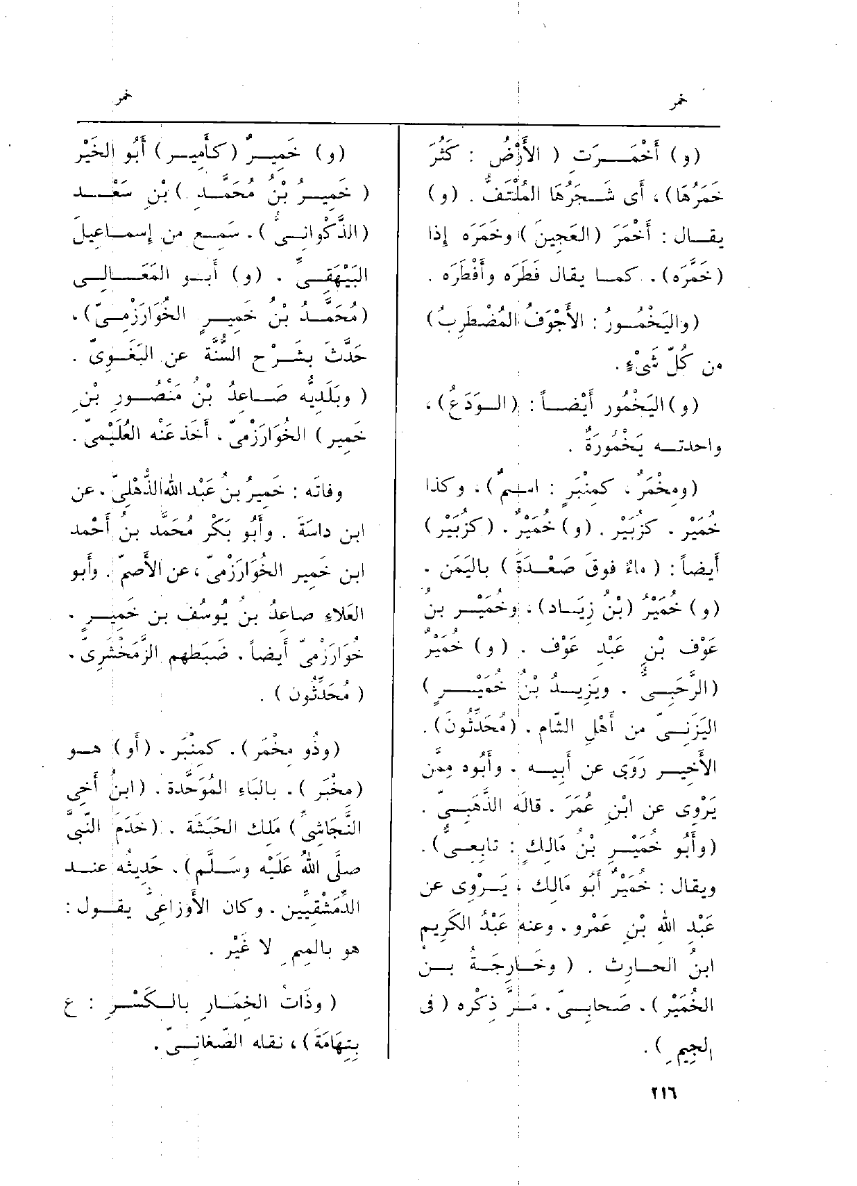 (ومِخْمَرٌ، كمِنْبَرٍ: اسمٌ) ، وَكَذَا خُمَيْر، كزُبَيْر. (و) خُمَيْرٌ، (كزُبَيْر) أَيضاً: (ماءٌ فوقَ صَعْدَةَ) باليَمَن، (و) خُمَيْرُ (بْنُ زِيَاد) ، وخُمَيْر بنُ عَوْ بْنِ عَبْدِ عَوْف، (و) خُمَيْرٌ (الرَّحَبِيُّ، ويَزيدُ بْنُ خُمَيْرٍ) اليَزَنِي من أَهْلِ الشّام، (مُحَدِّثُونَ) . الأَخِير رَوَى عَن أَبِيه، وأَبُوه مِمَّن يَرْوِي عَن ابْنِ عُمَرَ، قالَه الذَّهَبِيّ. (وأَبُو خُمَيْرِ بْنُ مَالِكٍ: تابِعِيٌّ) . وَيُقَال: خُمَيْرٌ أَبُو مَالِك، يَرْوِي عَن عَبْدِ اللَّهِ بْنِ عَمْرو، وَعنهُ عَبْدُ الكَرِيم ابنُ الحارِث. (وخَارِجَةُ بنُ الخُمَيْر) ، صَحَابِيّ، مَرَّ ذِكْره (فِي الجِيمِ) .