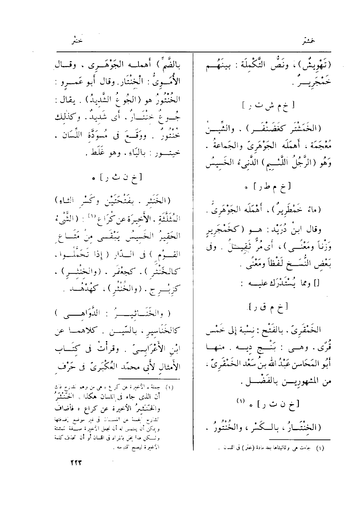 (والخَنَاثِيرُ: الدَّوَاهِي) كالخَنَاسِيرِ، بالسّين. كِلَاهُمَا عَن ابْنِ الأَعْرَابِيّ. وقرأْتُ فِي كِتَاب الأَمثالِ لأَبي محمّد العُكْبَريّ فِي حَرْفِ