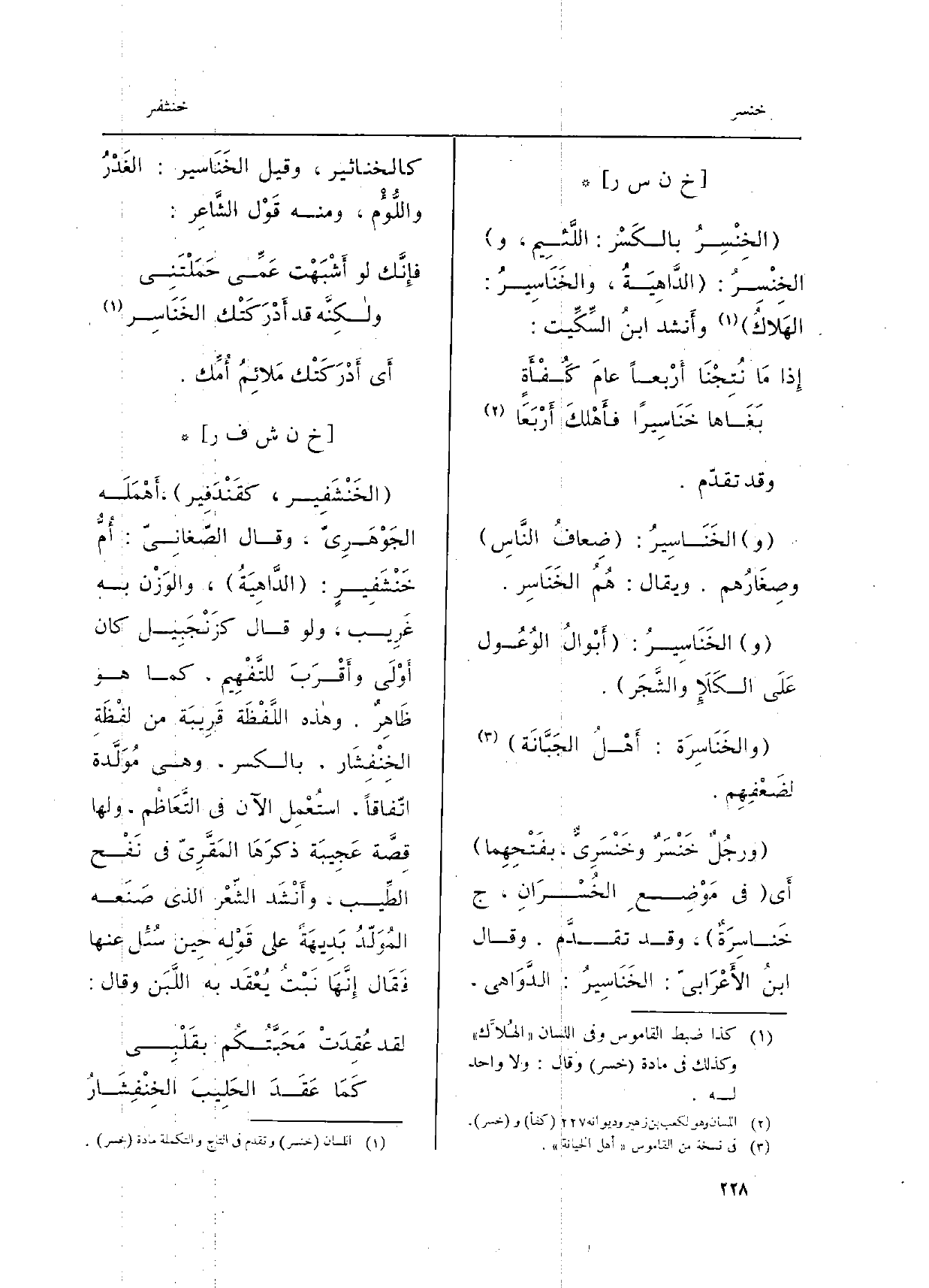 : (الخِنْسِرُ بالكَسْر: اللِّئِيم، و) الخِنْسِرُ: (الدَّاهِيَةُ، والخَنَاسِيرُ: الهَلاكُ) وأَنشد ابنُ السِّكِّيت: