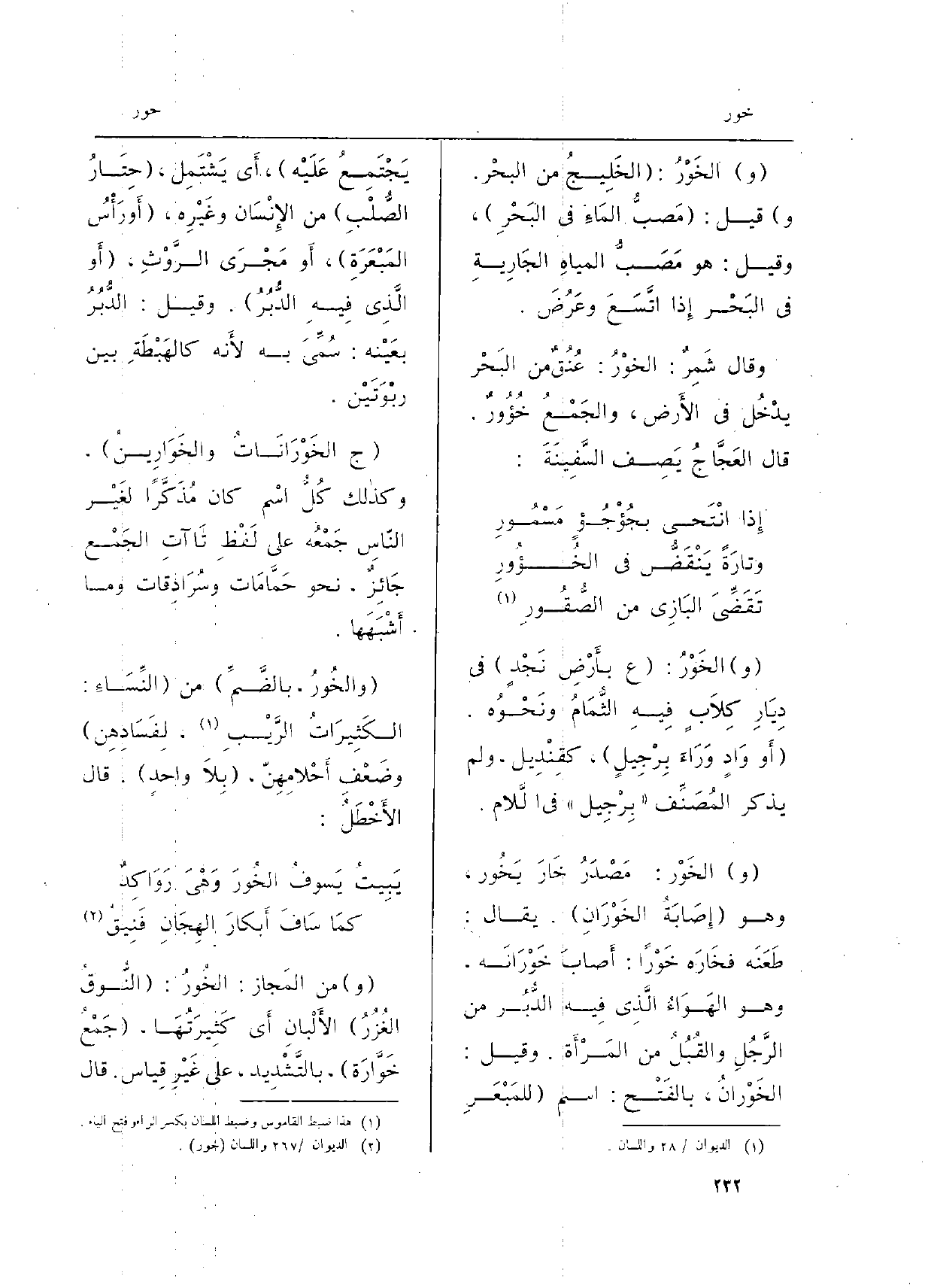 وَقَالَ شَمِرٌ: الخوْرُ: عُنُقٌ من البَحْر يدْخُل فِي الأَرض، والجَمْعُ {خُؤُورٌ. قَالَ العَجَّاجُ يَصِف السَّفِينَةَ: