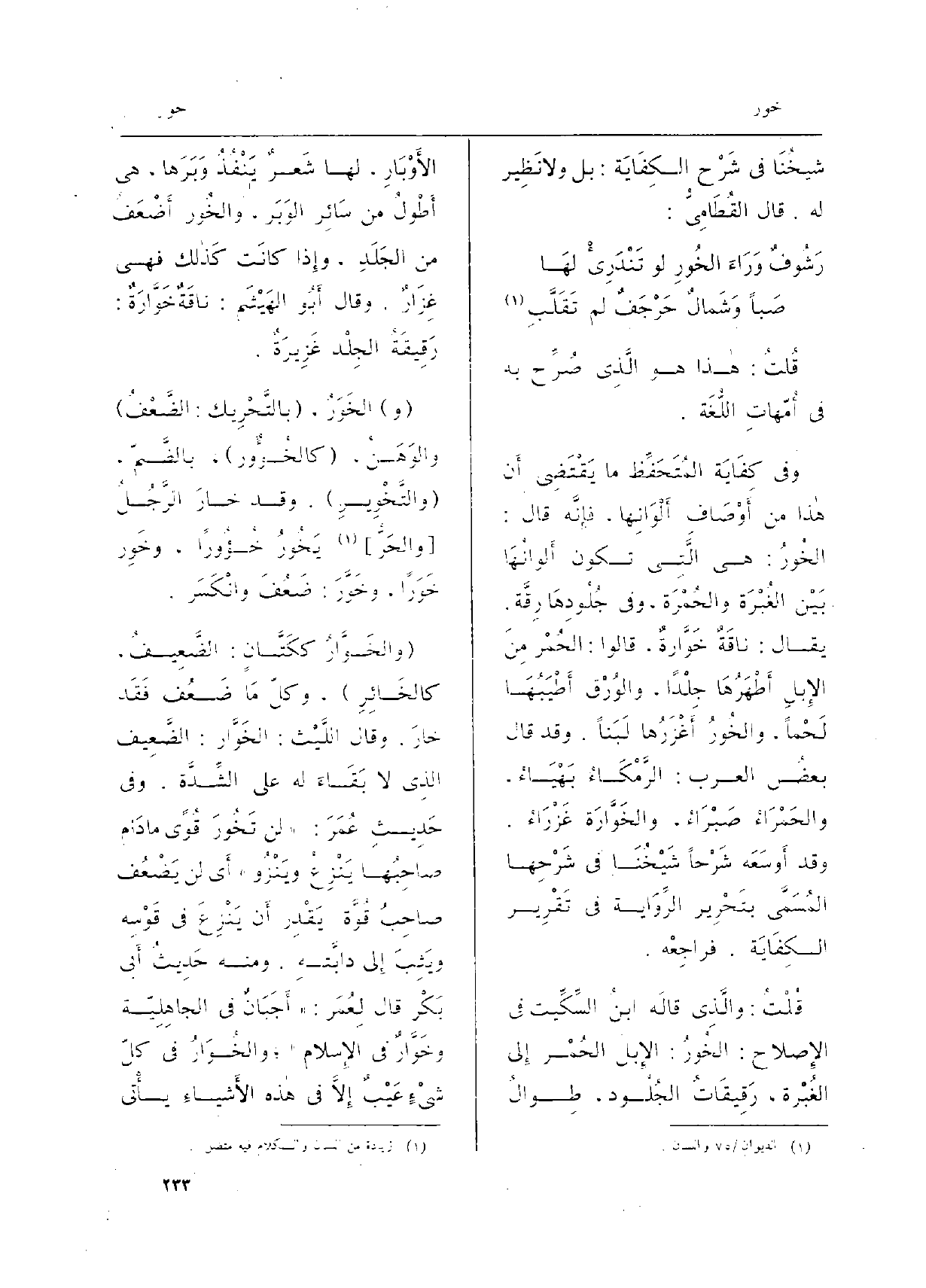 قُلْتُ: والَّذِي قالَه ابنُ السِّكِّيت فِي الإِصلاح: الخُورُ: الإِبل الحُمْر إِلى الغُبْرة، رَقِيقَاتُ الجُلُود، طِوالُ الأَوْبَارِ، لَهَا شَعرٌ يَنْفُذُ وَبَرَها، هِيَ أَطْولُ من سَائِر الوَبَر، {والخُور أَضْعَفُ من الجَلَدِ، وإِذا كانَت كَذالك فَهِيَ غِزَارٌ. وَقَالَ أَبو الهَيْثَم: ناقَةٌ} خَوَّارَةٌ: رَقِيقَةُ الجِلْد غَزِيرَةٌ.