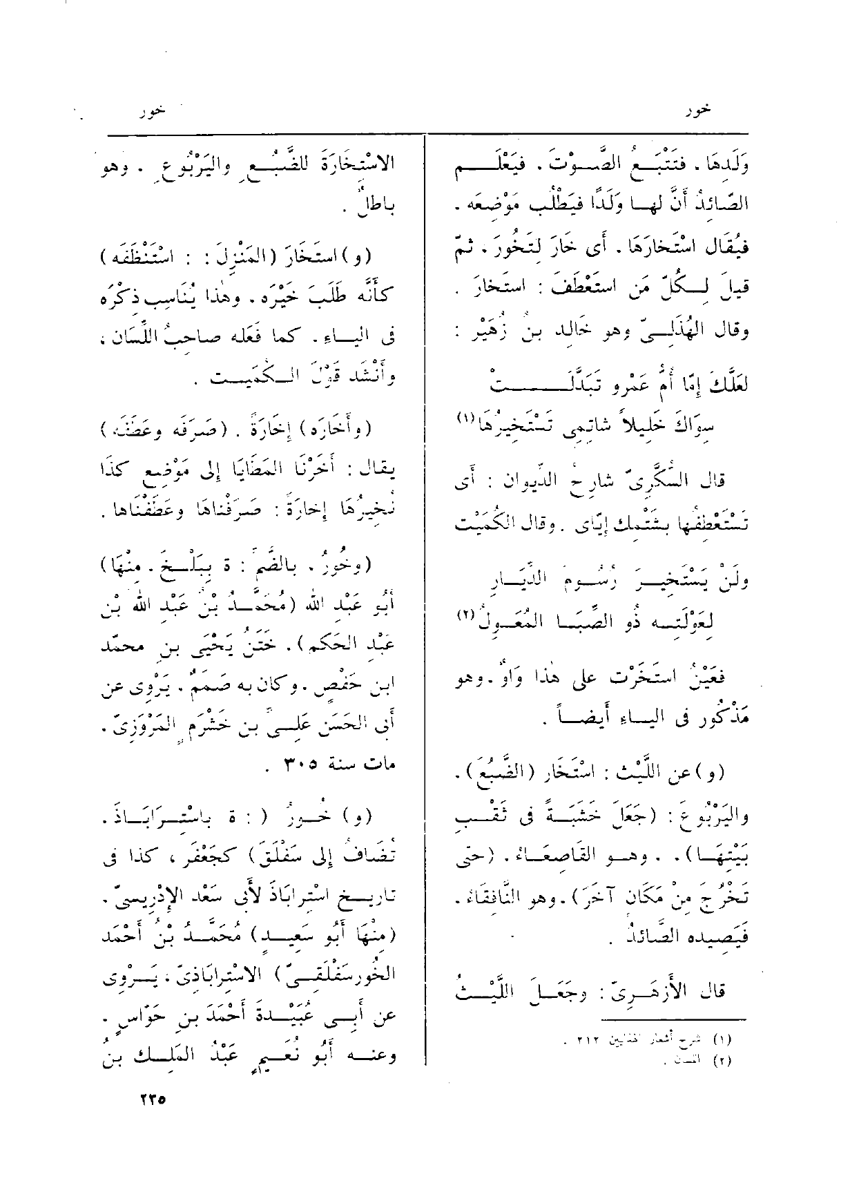كتاب قَالَ الأَزْهَرِيّ: وجَعَلَ اللَّيْثُ} الاسْتِخَارَةَ للضَّبُعِ واليَرْبُوعِ، وَهُوَ باطلٌ.