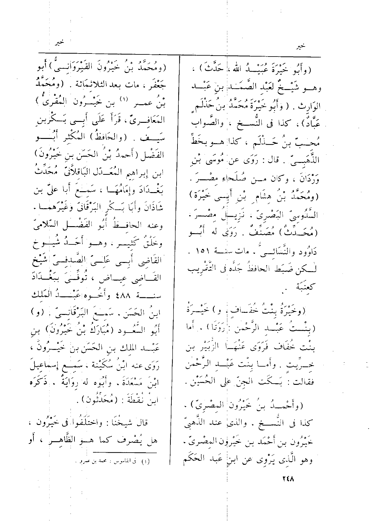 (وأَحْمدُ بنُ! خَيْرُون المِصْرِيّ) ، كَذَا فِي النُّسخ، وَالَّذِي عِنْد الذَّهبيّ خَيْرُون بن أَحْمَد بن خَيْرون المِصْريّ، وَهُوَ الَّذِي يَرْوِي عَن ابنِ عَبد الحَكَم (ومُحَمَّدُ بْنُ خَيْرُونَ القَيْرَوَانِيُّ) أَبو جَعْفَر، مَاتَ بعد الثلاثِمَائة. (ومُحَمَّدُ بْنُ عمر بن خَيْرُون المُقْرىءُ) المَعَافِريّ، قَرَأَ عَلَى أَبي بَكْر بنِ سَيف. (والحَافِظُ) المُكْثِر أَبُو الفَضْل (أَحمدُ بْنُ الحَسَن بنِ خَيْرُونَ) ابْن إِبراهِيم المُعَدّل البَاقِلاَّنِيّ مُحَدِّثُ بَغْدَادَ وَإِمَامُهَا، سَمِعَ أَبا عليّ بن شَاذَانَ وَأَا بَكْرٍ البَرْقَانيّ وغَيْرَهما، وَعنهُ الحافِظُ أَبُو الفَضْل السّلاميّ وخَلْقٌ كَثِير، وَهُوَ أَحَدُ شُيوخ القَاضي أَبِي عَلِيّ الصَّدفِيّ شَيْخ القَاضِي عِياض، تُوفِّيَ ببَغْدَادَ سنة 488 وأَخُوه عَبْدُ المَلِك ابنُ الحَسَن، سَمِعَ البَرْقَانِيّ. (و) أَبُو السُّعُود (مُبَارَكُ بْنُ خَيْرُونَ) بنِ عَبْد الملِك بنِ الحَسَن بن خَيْرُونَ، رَوَى عَنهُ ابْنُ سُكَيْنة، سَمِع إِسماعيلَ ابْنَ مَسْعَدَة، وَأَبُوه لَهُ رِوَايَةٌ، ذَكَرَه ابنُ نُقْطَةَ: (مُحَدِّثُون) .
