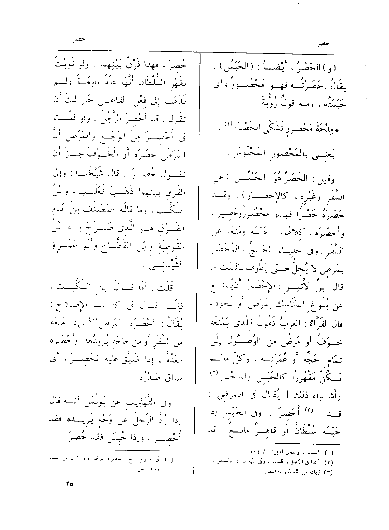 وَقيل: الحَصْرُ هُوَ الحَبْسُ (عنِ السَّفَرِ وغَيْرِهِ، كالإِحصار) : وَقد حَصَرَهُ حَصْراً فَهُوَ مَحْصُورٌ، وحَصِيرٌ، وأَحصَرَه، كِلاهُما: حَبَسَه ومَنعَه عَن السَّفَرِ. وَفِي حدِيثِ الحَجِّ (المُحْصَر بمَرضٍ لَا يُحِلُّ حَتَّى يَطُوفَ بالبيْت) . قَالَ ابنُ الأَثيرِ: الإِحْصَارُ أَنْ يُمنَع عَن بُلُوغِ المَنَاسِكِ بمَرَضٍ أَو نَحْوِه، قَالَ الفَرَّاءُ: العربُ تَقُولُ لِلَّذِي يَمْنَعُه خوْفٌ أَو مَرضٌ من الوُصُولِ إِلَى تمَامٍ حَجِّه أَو عُمْرَتِه، وكلُّ مَا لم يكُنْ مَقْهُوراً كالحَحسِ والسِّحْر وأَشباه ذالك (يُقال فِي المَرضِ: قدخ أُحْصِرَ. وَفِي الحَبْسِ إِذا حَبَسَه سُلْطَانٌ أَو قَاهِرٌ مانِعٌ: قد حُصِرَ، فهاذا فَرْقُ بَيْنِهما. وَلَو نويْتَ بقَهْرِ السُّلْطَان أَنَّهَا علَّةٌ مانِعَةٌ وَلم تَذْهَب إِلَى فِعْلِ الفاعِل جَازَ لَكَ أَن تَقُولَ: قد أُحْصِرَ الرَّجُلُ. وَلَو قلْت فِي أُحْصِرَ مِنَ الوَجَع والمَرَض أَنَّ المَرَضَ حَصَرَه أَو الْخوْفَ جازَ أَن تَقول حُصِرَ. قَالَ شَيْخُنا: وإِلى الفَرقِ بَينهمَا ذَهَبَ ثَعْلَب، وابْنُ السِّكِّيت، وَمَا قالَه المُصَنِّف مِنْ عَدم الفَرْقِ هُوَ الَّذِي صَرَّحَ بِهِ ابْنُ القُوطِيّةِ وابْنُ القَطَّاع وأَبُو عَمْرٍ والشَّيْبَانِيُّ.