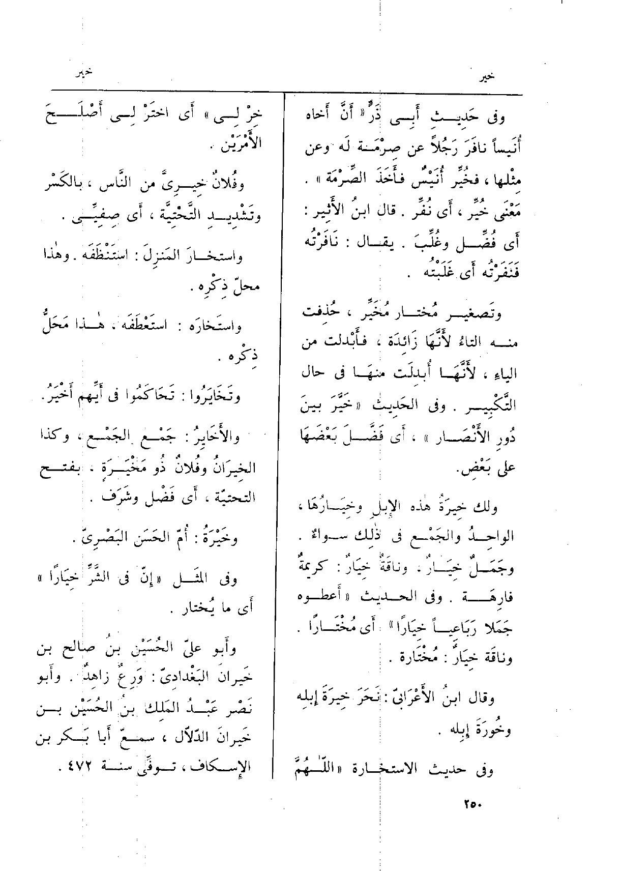 وَفِي حَدِيث الاستخارة (اللَّهُمَّ {خِرْ لِي) أَي} اختَرْ لِي أَصْلَحَ الأَمْرَيْن.