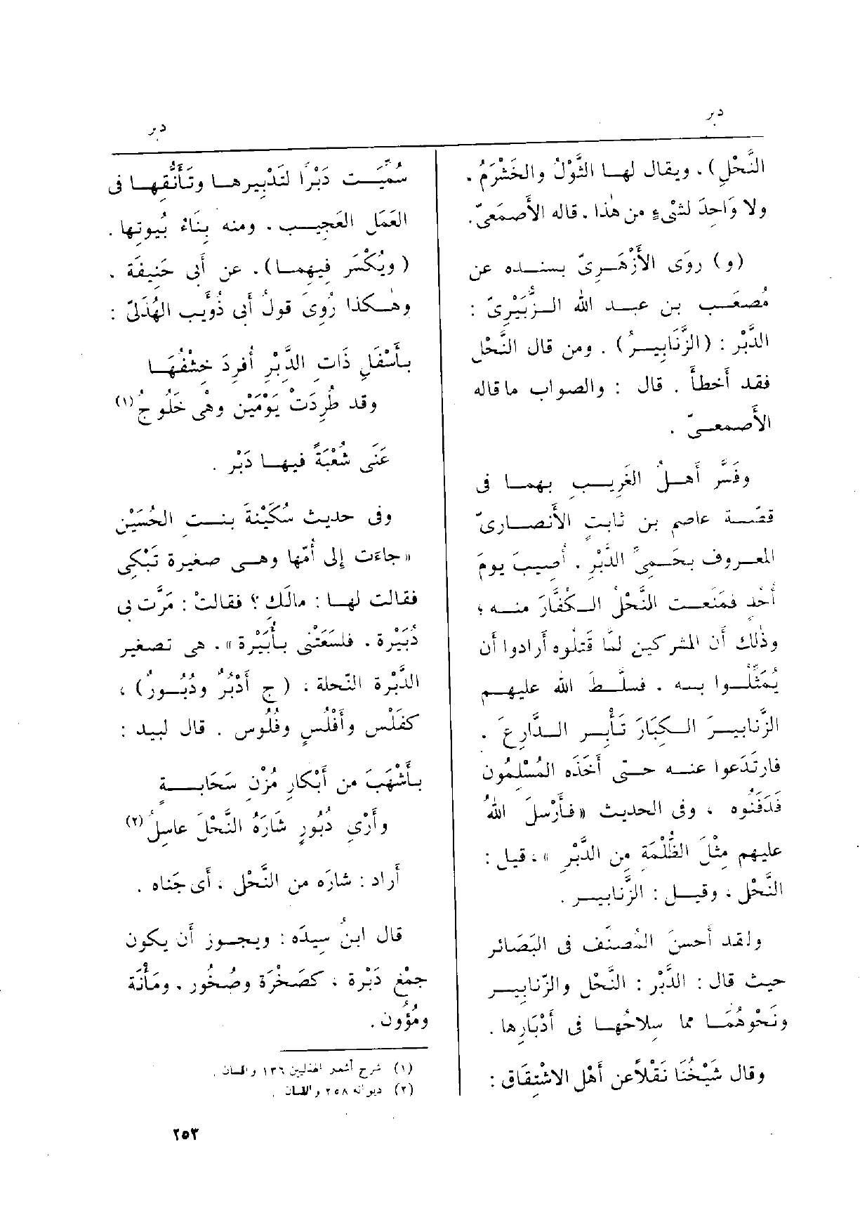 وَفِي حَدِيث سُكَيْنةَ بنتِ الحُسَيْن (جاءَت إِلى أُمّها وَهِي صَغِيرَة تَبْكِي فَقَالَت لَهَا: مالَكِ؟ فقالتْ: مَرَّت بِي دُبَيْرة، فلسَعَتْني بأُبَيْرة) ، هِيَ تَصْغِير الدَّبْرة النّحلة، (ج أَدْبُرٌ ودُبُورٌ) ، كفَلْس وأَفْلُسٍ وفُلُوس. قَالَ لبيد: