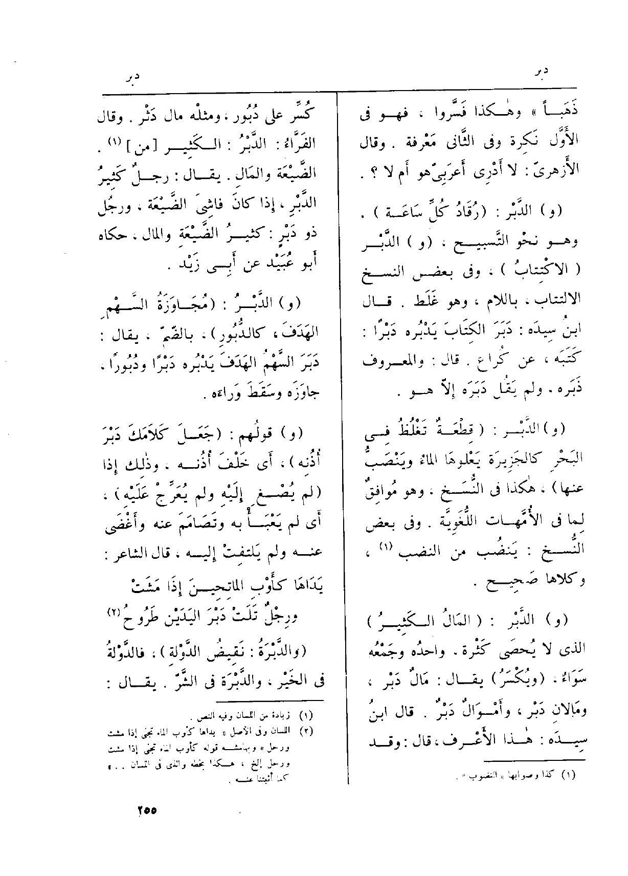 (و) الدَّبْر: (المَالُ الكَثِيرُ) الَّذِي لَا يُحصَى كَثْرة، واحدُه وجَمْعُه سَوَاءٌ، (ويُكْسَرُ) يُقَال: مَالٌ دَبْر، ومَالانِ دَبْر، وأَمْوالٌ دَبْرٌ. قَالَ ابنُ سِيدَه: هاذا الأَعْرف، قَالَ: وَقد كُسِّر على دُبُور، ومثلْه مَال دَثْر. وَقَالَ الفَرَّاءُ: الدَّبْرُ: الكَثِير (من) . الضَّيْعَة والمَال. يُقَال: رجلٌ كَثِيرٌ الدَّبْرِ، إِذا كانَ فاشِيَ الضَّيْعَة، ورجُل ذُو دَبْرٍ: كثيرُ الضَّيْعَةِ وَالْمَال، حَكَاهُ أَبو عُبَيْد عَن أَبِي زَيْد.