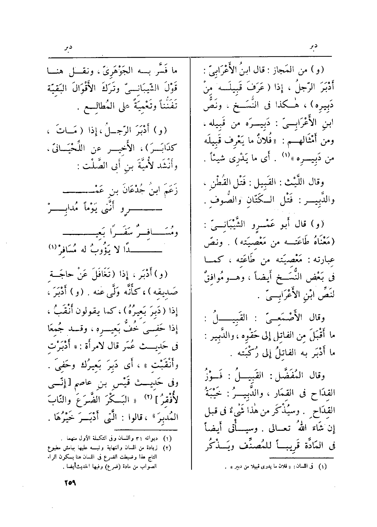 وَقَالَ المُفَضَّل: القَبِيلُ: فَوْزُ القِدَاح فِي القِمَار، والدَّبِيرُ: خَيْبَةُ القِدَاحِ. وسيُذْكَر من هاذا شَيْءٌ فِي قبل إِن شَاء اللَّهُ تَعالى. وسيأْتي أَيضاً فِي المَادَّة قَرِيباً للمُصنِّف ويَذْكُر مَا فَسَّر بِهِ الجَوْهَرِيّ، وَنقل هُنَا قَوْلَ الشّيبانِيّ وتَرَكَ الأَقْوَالَ البَقِيّة تَفَنُّناً وتَعْمِيَةً على المُطالِع.