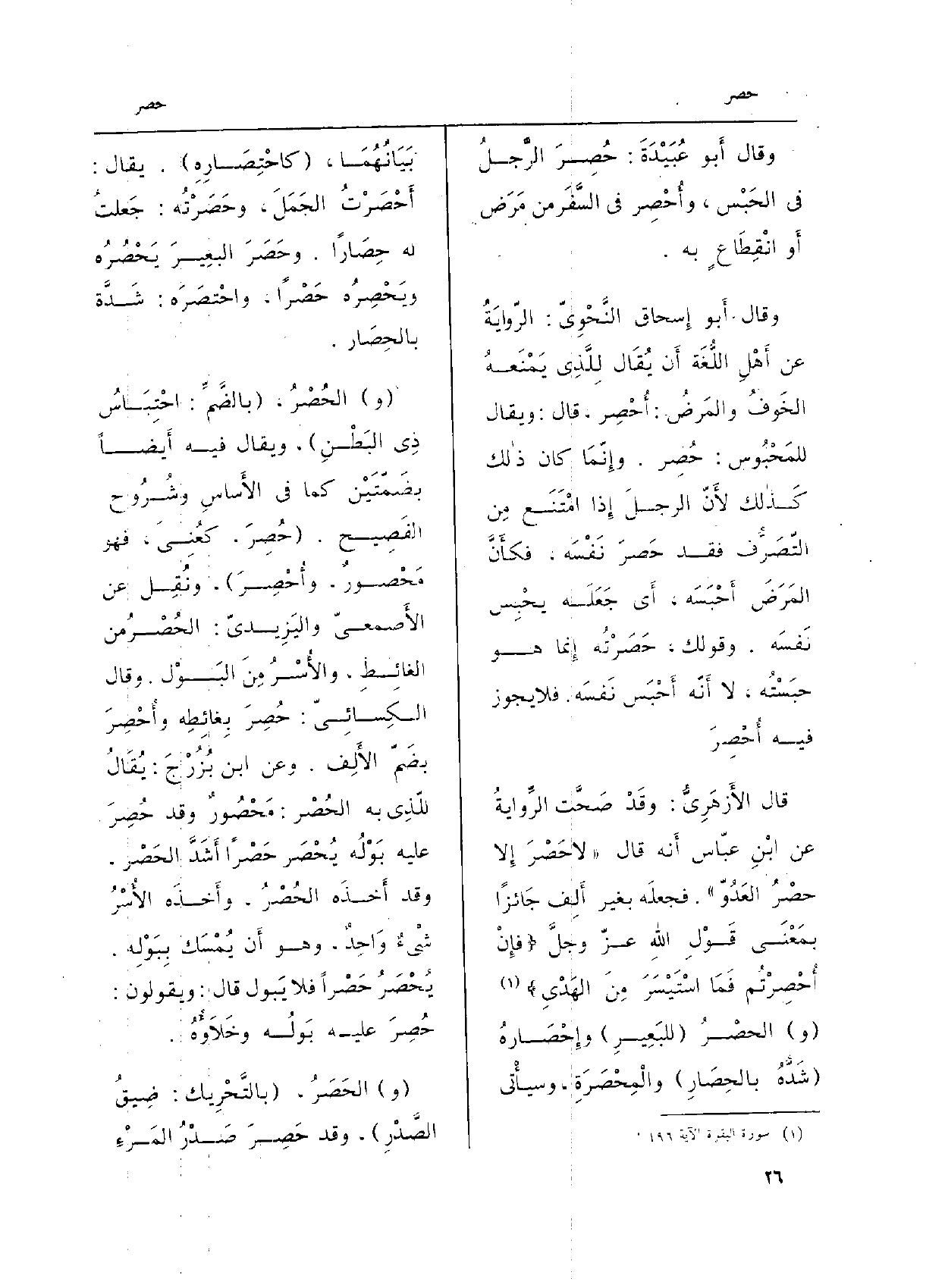 قَالَ الأَزهَرِيُّ: وقَدْ صَحَّت الرِّوايةُ عَن ابْنِ عبّاس أَنه قَالَ (لَا حَصْرَ إِلا حصْرُ العَدُوّ) . فجعلَه بِغَيْر أَلِف جَائزاً بمَعْنَى قَوْلِ الله عزّ وجلَّ {) 1 (. 002 فَإِن أحصرتم فَمَا اسْتَيْسَرَ من الْهدى} (الْبَقَرَة: 196) (و) الحصْرُ (للبَعِيرِ) وإِحْصَارهُ (شَدُّهُ بالحِصَارِ) والْمِحْصَرَةِ، وسيأْتي بَيَانُهُمَا، (كاحْتِصَارِهِ) . يُقَال: أَحْصَرْتُ الجَمَلَ، وحَصَرْتُه: جَعلتُ لَهُ حِصَاراً. وحَصَرَ البعِيرَ يَحْصُرُه ويَحْصِرُه حَصْراً، واحْتصَرَه: شَدَّة بالحِصَار.