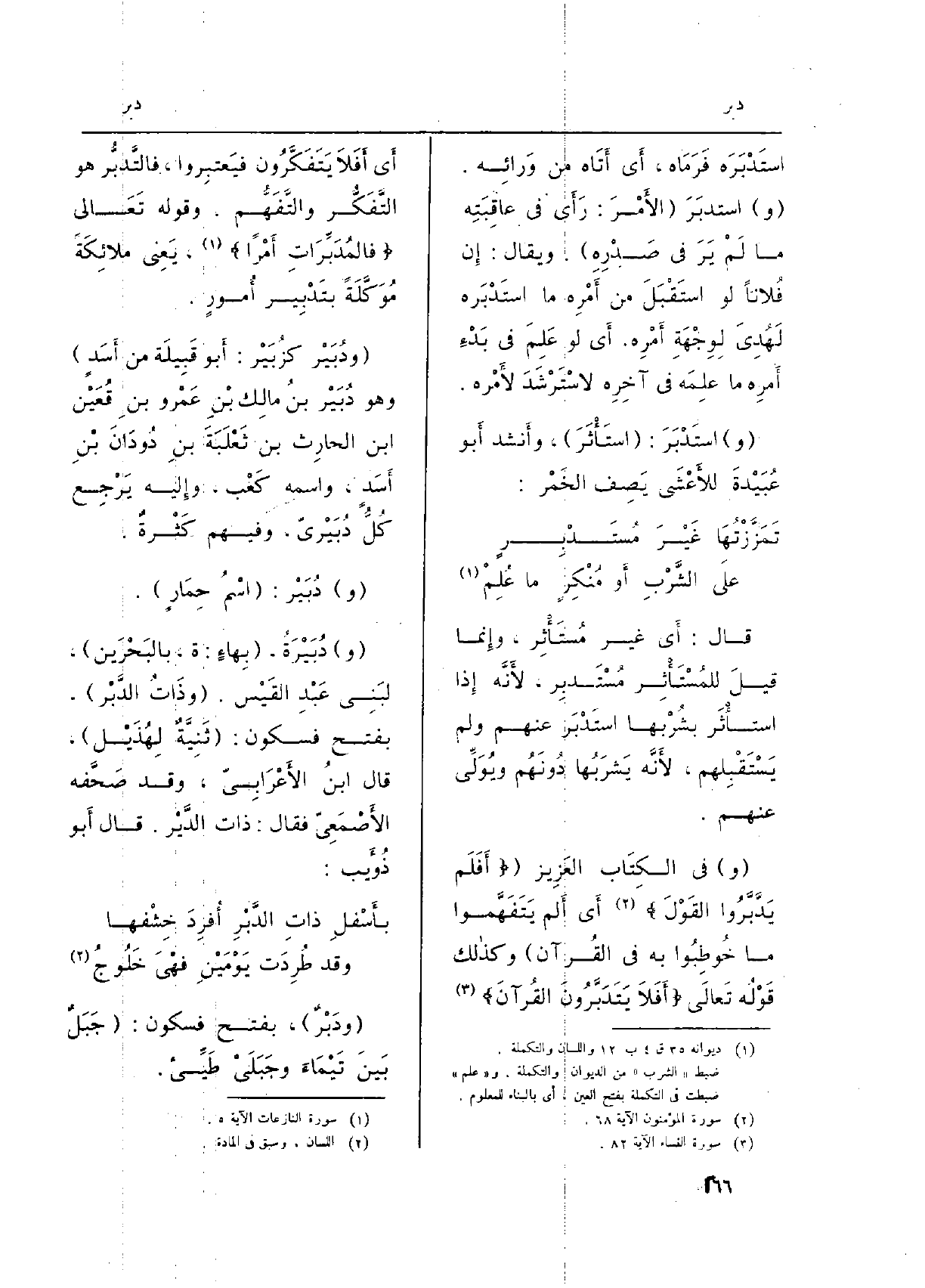 (و) فِي الكِتَاب العَزِيز ( {أَفَلَمْ يَدَّبَّرُواْ الْقَوْلَ} أَي (الْمُؤْمِنُونَ: 68) أَلم يَتَفَهَّموا مَا خُوطِبُوا بِهِ فِي الْقُرْآن) وكذالك قَوْلُه تَعالَى: {أَفَلاَ يَتَدَبَّرُونَ الْقُرْءانَ} (النِّسَاء: 82) أَي أَفَلا يَتَفَكَّرُون فيَعتِبروا، فالتَّدبُّر هُوَ التَّفَكُّر والتَّفَهُم. وَقَوله تَعَالى {فالمُدَبِّرَاتِ أَمْراً} (سُورَة النازاعات الْآيَة 5) ، يَعنِي ملائِكَةً مُوَكَّلَةً بتَدْبِير أُمورٍ.