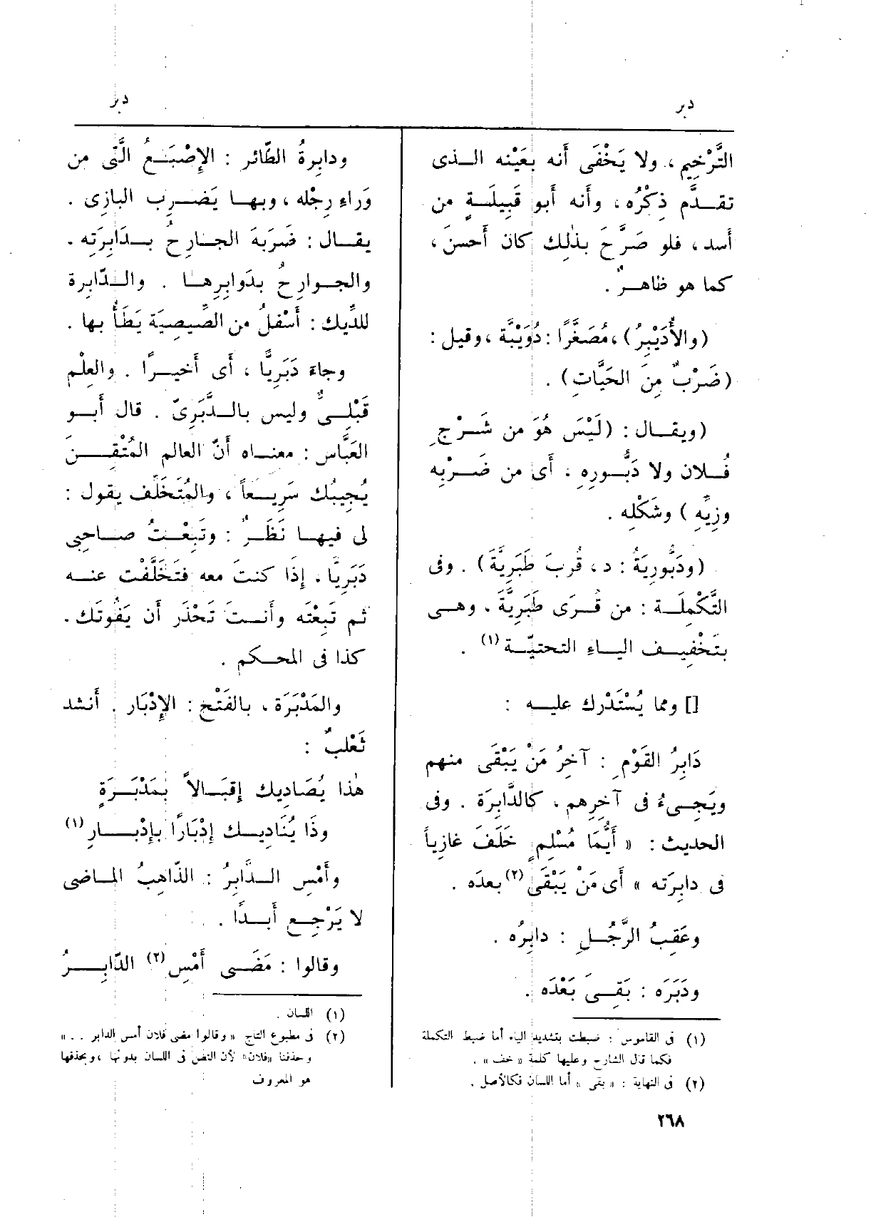 ودابِرَةُ الطّائر: الإِصْبَعُ الَّتي من وَارءِ رِجْله، وَبهَا يَضرِب البازِي. يُقَال: ضَرَبَهَ الجارِحُ بدَابِرَتِه، والجوارِحُ بدَوابِرِها. والدّابِرة للدِّيك: أَسْفلُ من الصِّيصِيَة يَطَأْ بهَا.