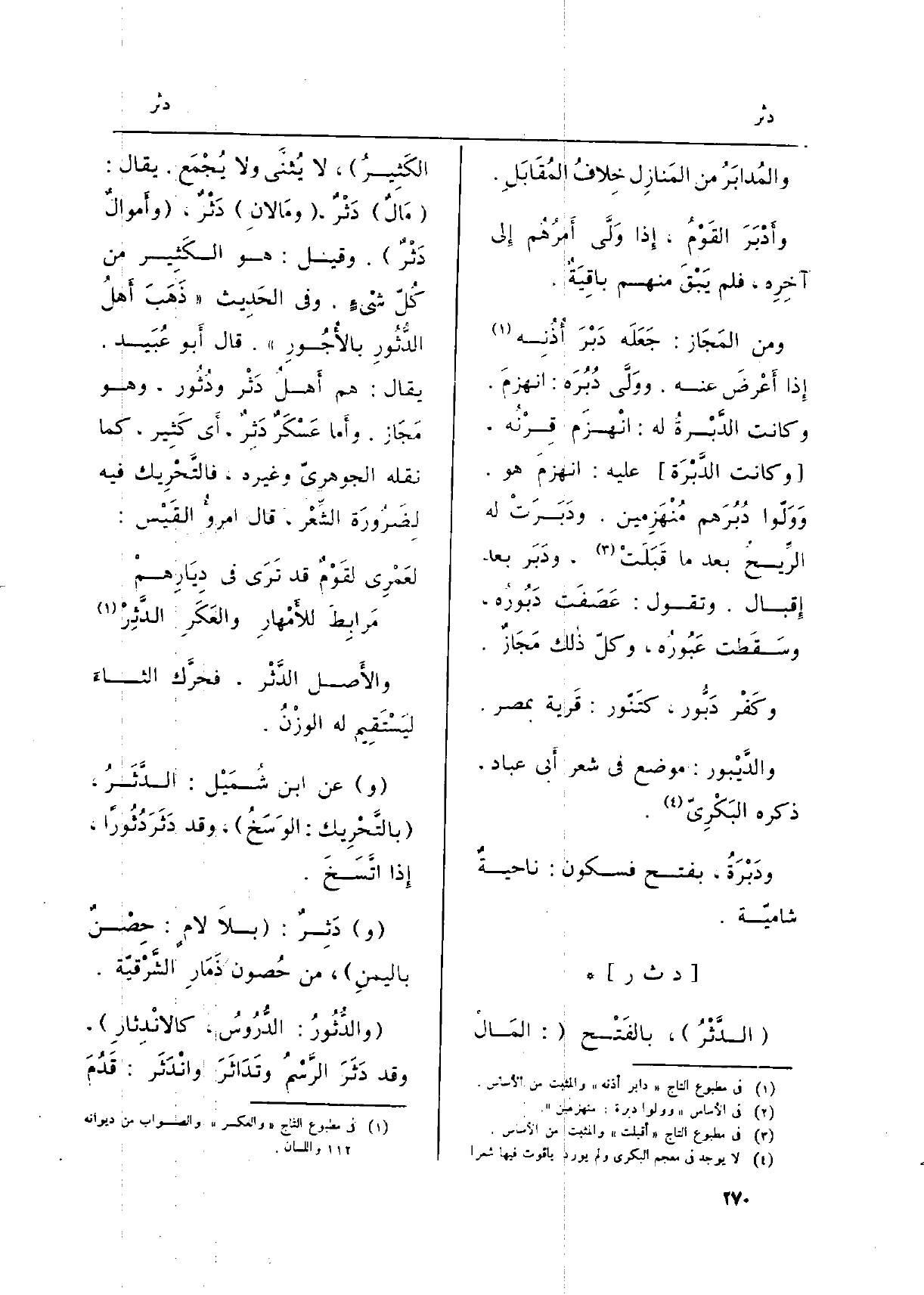 : (الدَّثْرُ) ، بالفَتْح (: المَالُ الكَثِيرُ) ، لَا يُثنأ وَلَا يُجْمَع. يُقَال: (مَالٌ) دَثْرٌ، (ومَالانِ) دَثْرٌ، (وأَموالٌ دَثرٌ) . وَقيل: هُوَ الكَثِير من كُلّ شَيْءٍ. وَفِي الحَدِيث (ذَهَبَ أَهلُ الدُّثُورِ بالأُجُورِ) . قَالَ أَبو عُبَيد. يُقَال: هم أَهلُ دَثْر ودُثُور، وَهُوَ مَجَاز. وأَما عَسْكَرٌ دَثِرٌ، أَي كَثِير، كَمَا نَقله الجوهريّ وَغَيره، فالتَّحْرِيك فِيهِ لِضَرُورَة الشِّعْر، قَالَ امرؤُ القَيْس:
