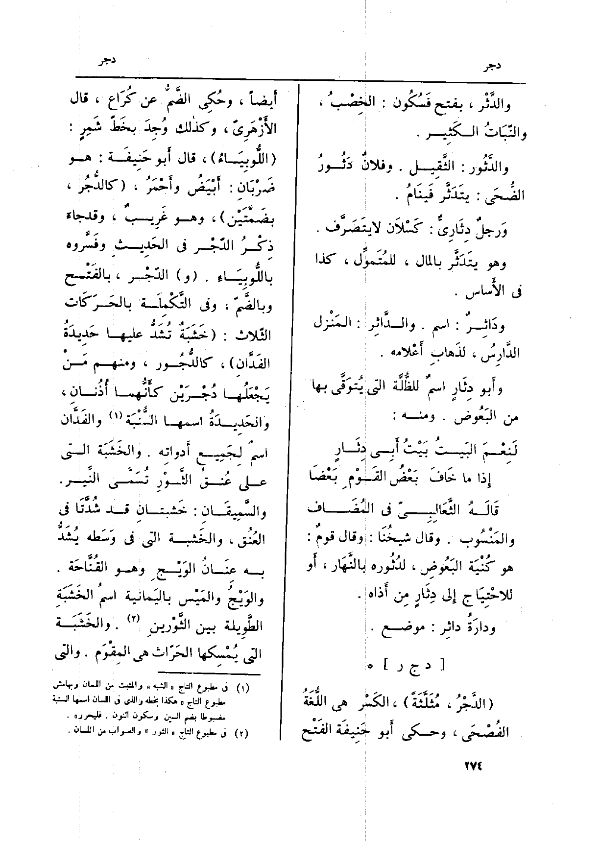 : (الدَّجْرُ، مُثَلَّثَةً) ، الكَسْر هِيَ اللُّغَةُ الفُصْحَى، وَحكى أَبو حَنِيفَة الفَتْح أَيضاً، وحُكِي الضَّمُّ عَن كُرَاع، قَالَ الأَزْهرَيّ، وكذالك وُجِدَ بخَطّ شَمِرٍ: (اللُّوبِيَاءُ) ، قَالَ أَبو حَنِيفَة: هُوَ ضَرْبَانِ: أَبْيضُ وأَحْمَرُ، (كالدُّجُر، بضَمَّتَيْن) ، وَهُوَ غَرِيبٌ، وَقد جاءَ ذِكْرُ الدّجْر فِي الحَدِيثِ وفَسَّروه باللُّوبِيَاءِ. (و) الدّجْر، بالفَتْح وبالضَّمّ، وَفِي التَّكْمِلَة بالحَرَكَات الثّلاث: (خَشَبَةٌ تُشَدُّ عَلَيْهَا حَدِيدَةُ الفَدَّانِ) ، كالدُّجُور، وَمِنْهُم مَنْ يَجْعَلُها دُجْرَيْن كأَنُّهما أُذُنانِ، والحَدِيدَةُ اسْمهَا السُّنْبَة والفَدَّان اسمٌ لِجَميع أَدواتِه. والخَشَبَة اتي على عُنقُ الثَّوْرِ تُسَمَّى النِّير. والسَّمِيقَانِ: خَشبتانِ قد شُدَّتَا فِي العُنُق، والخَشبة الَّتِي فِي وَسَطه يُشَدُّ بِهِ عَنَانُ الوَيْحّ وَهُوَ القُنَّاحَة. والوَيْجُ والمَيْس باليَمانية اسمُ الخَشَبَةِ الطَّوِيلة بَين الثَّوْرينِ. والخَشَبَة الَّتِي يُمْسِكها الحَرّاث هِيَ المِقَوْم. وَالَّتِي