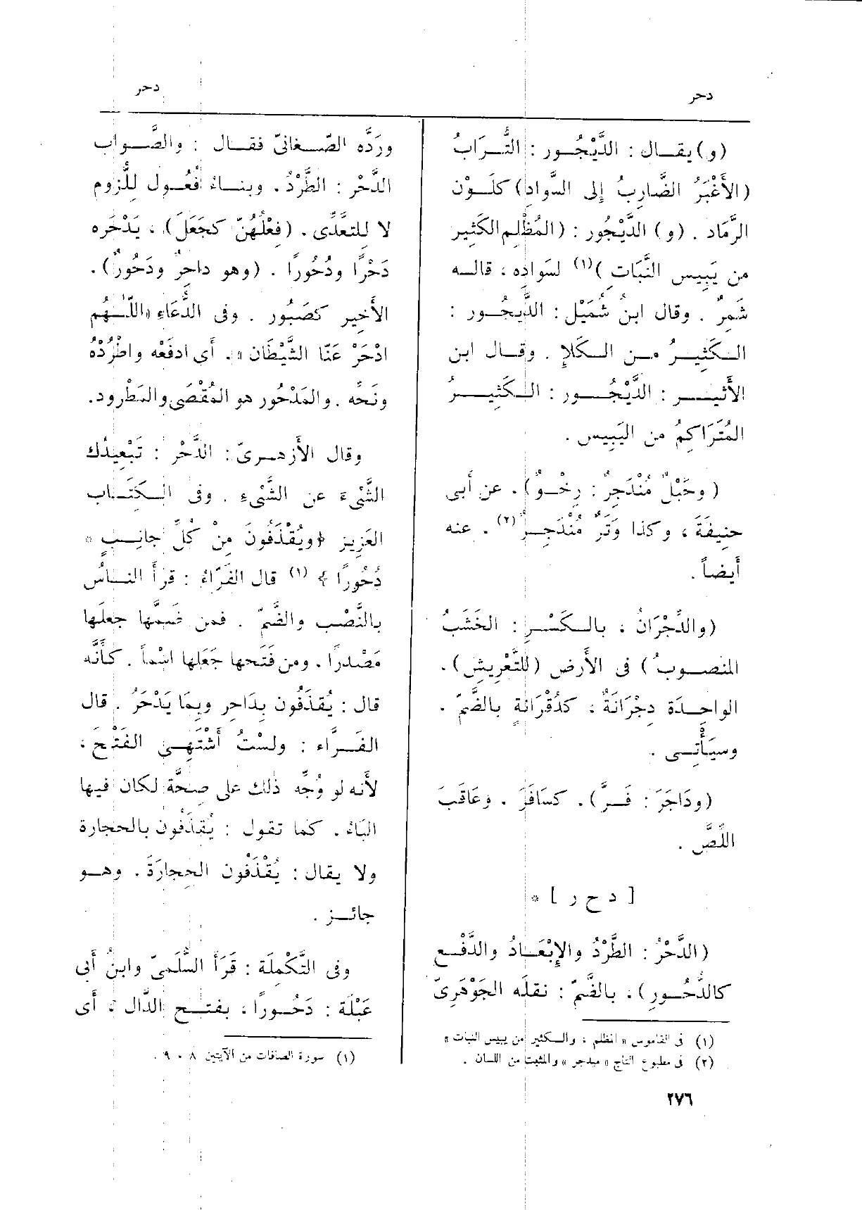 وَقَالا الأَزهريّ: الدَّحْر: تَبْعِيدُك الشَّيءَ عَن الشَّيْءَ. وَفِي الكِتَاب العَزِيز {) 1 (. 017 ويفقدون من كل جَانب} دُحُوراً (الصافات: 8، 9) قَالَ الفَرّاءُ: قرأَ الناسُ بالنَّصْب والضَّمّ. فَمن ضَمَّها جعلَها مَصْدراً، وَمن فَتَحها جَعَلها اسْماً. كأَنَّه قَالَ: يُقذَفُون بِدَاحِر وبِمَا يَدْحَرُ. قَالَ الفَرًّء: ولسْتُ أَشْتَهِي الفَتْحَ، لأَنه لَو وُجِّه ذالك على صِحَّة لَكَانَ فِيهَا البَاءُ، كَا تَقول: يُقذَفُون بِالْحِجَارَةِ وَلَا يُقَال: يُقْذَفُون الحِجارَةَ، وَهُوَ جَائِز.