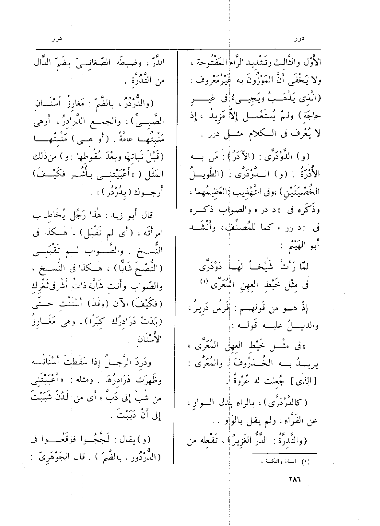 الأَوّل والثَّالِث وتَشْدِيد الرَّاء المَفْتُوحة، وَلَا يَخْفَى أَنَّ المَوْزُونَ بِهِ غَيْرُ مَعْروف: (الَّذِي يَذْهَبُ ويَجِيىءُ فِي غيرِ حاجَةٍ) ولمْ يُستَعْمل إِلاّ مَزِيداً، إِذ لَا يُعْرف فِي الْكَلَام مثل دُرَر.