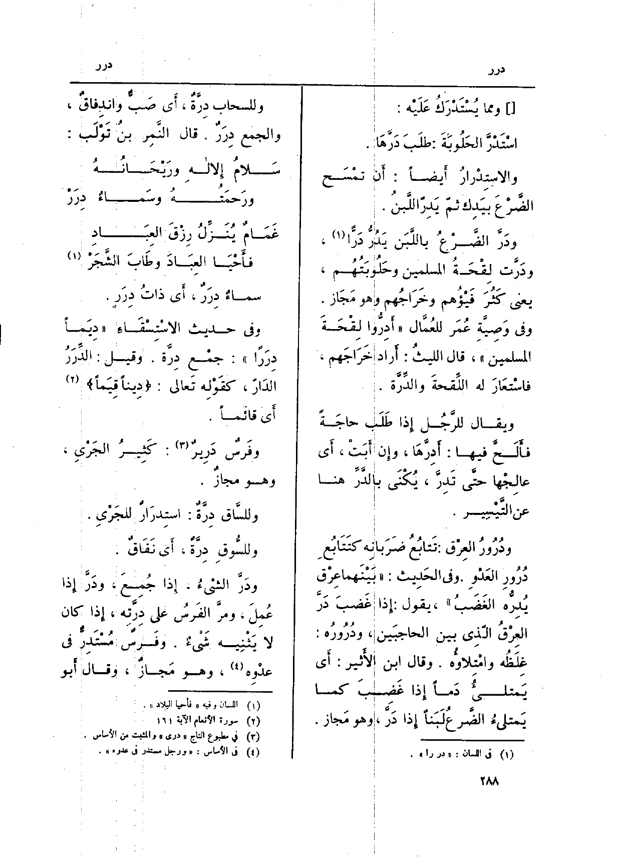 } ودَرَّ الضَّرْعُ باللَّبَن {يَدُرُّ} دَرًّا، {ودَرَّت لِقْحَةُ الْمُسلمين وحَلُوبَتُهُم، يَعْنِي كَثُرَ فَيْؤُهم وخَرَاجُهم وَهُوَ مَجَاز. وَفِي وَصِيَّةِ عُمَر للعُمَّال (} أَدِرُّوا لِقْحَةَ الْمُسلمين) ، قَالَ الليثُ: أَراد خَرَاجَهم، فاسْتَعَارَ لَهُ اللقِّحقةَ {والدِّرَّة.