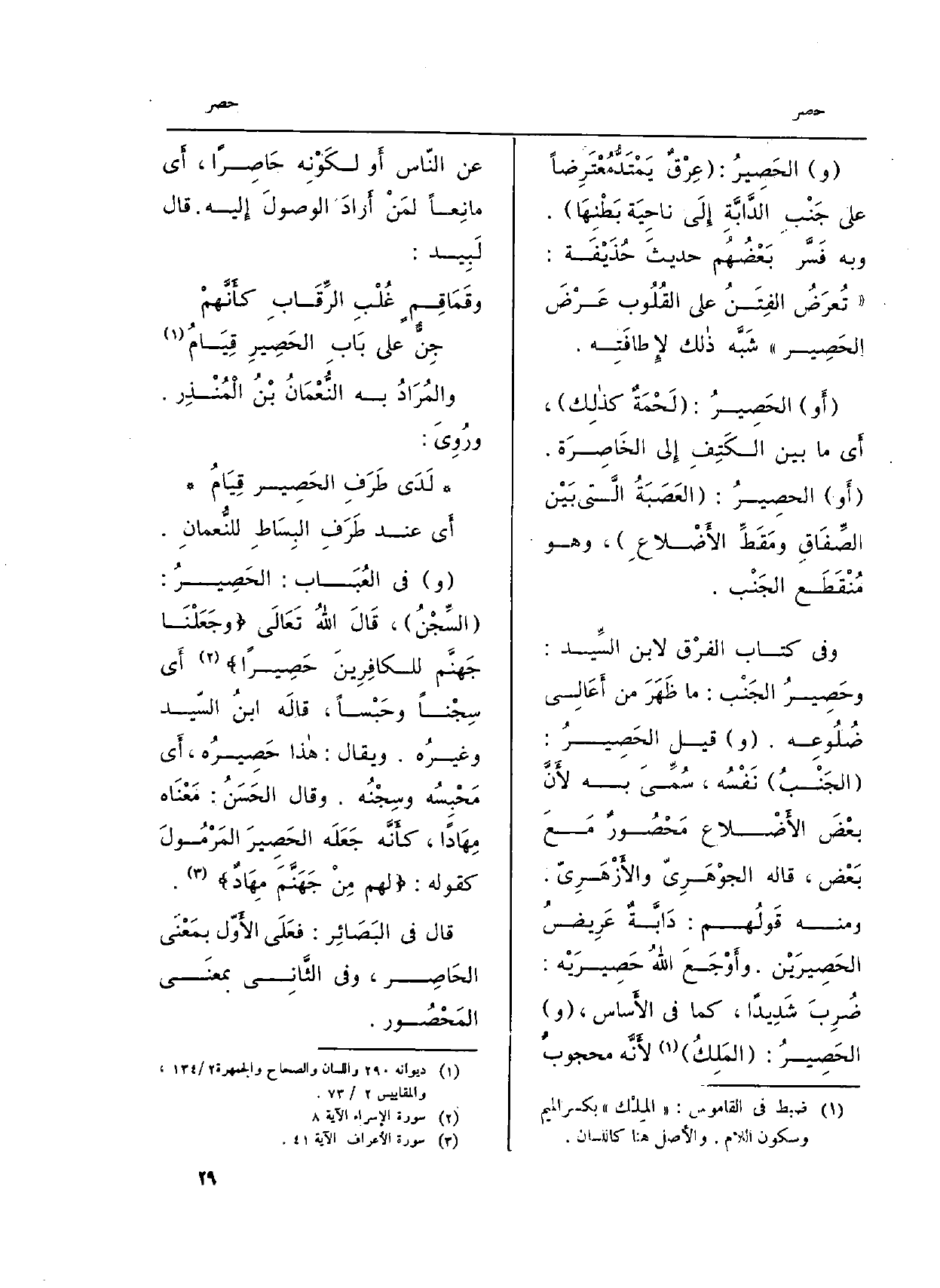 وَفِي كتاب الفرْق لِابْنِ السِّيد: وحَصِيرُ الجَنْب: مَا ظَهَرَ من أَعَالِي ضُلُوعِه. (و) قيل الحَصِيرُ: (الجَنْبُ) نَفْسُه، سُمِّيَ بِهِ لأَنَّ بعْضَ الأَضْلاع مَحْصُورٌ مَعَ بَعْض، قَالَه الجوْهَرِيّ والأَزْهَرِيّ. وَمِنْه قَولِم: دَابَّةٌ عَرِيضُ الحَصِيرَيْن. وأَوْجَعَ اللَّهُ حَصِيرَيْه: ضُرِبَ شَدِيداً، كَمَا فِي الأَساس، (و) الحَصِيرُ: (المَلِكُ) لأَنَّه محجوبٌ عَن النّاس أَو لكَوْنِه حَاصِراً، أَي مانِعاً لمَنْ أَرَادَ الوصولَ إِليه. قَالَ لَبِيد: