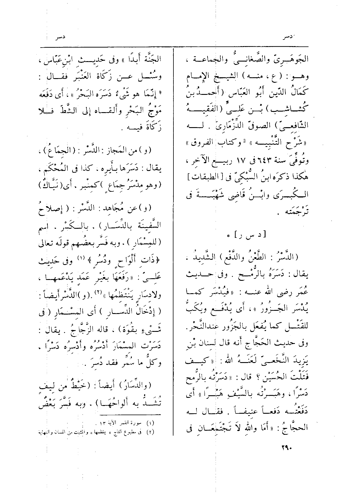 الجَوهَرِيّ والصَّغانِيُّ وَالْجَمَاعَة، وَهُوَ: (ع، مِنْهُ) الشَّيْخ الإِمام كَمَالُ الدّين أَبُو العَبّاس (أَحمدُ بنُ كُشاشِب) بْن عَلِيَ (الفَقِيهُ الشّافِعِيّ) الصوفيّ الدِّزْمَارِيّ. لَهُ (شَرْح التَّنْبِيه) (وَكتاب الفروق) وتُوفِّيَ سنة 643 فِي 17 ربيع الآخِر، هاكذا ذكرَه ابنُ السُّبْكِيّ فِي (الطَّبَقَات) الكُبرَى وابْنُ قَاضِي شَهْبَةَ فِي تَرْجَمَته.