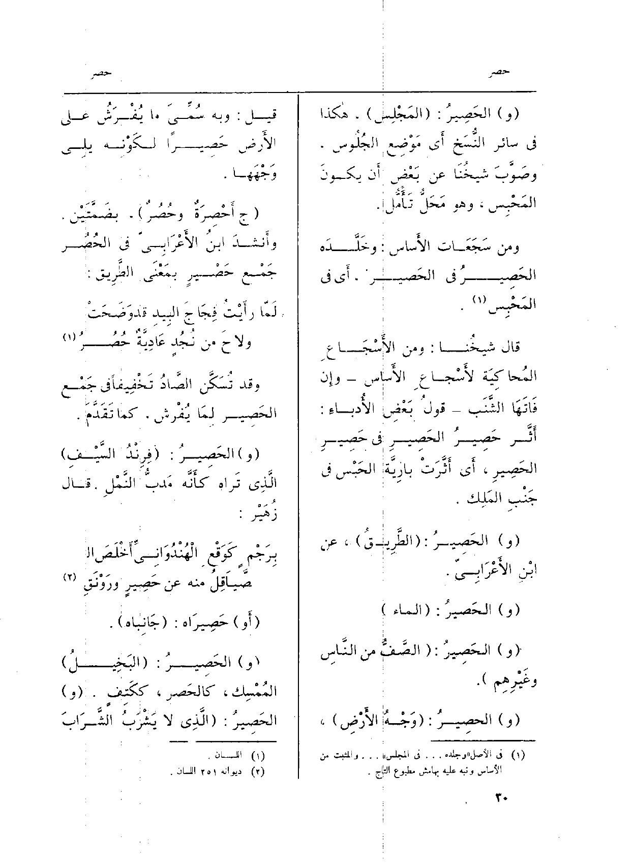 (ج أَحْصِرَةٌ وحُصُرٌ) ، بضَمَّتَيْن. وأَنشدَ ابنُ الأَعْرَابِيّ فِي الحُصُر جَمْع حَصْيرٍ بمَعْنَى الطَّرِيق: