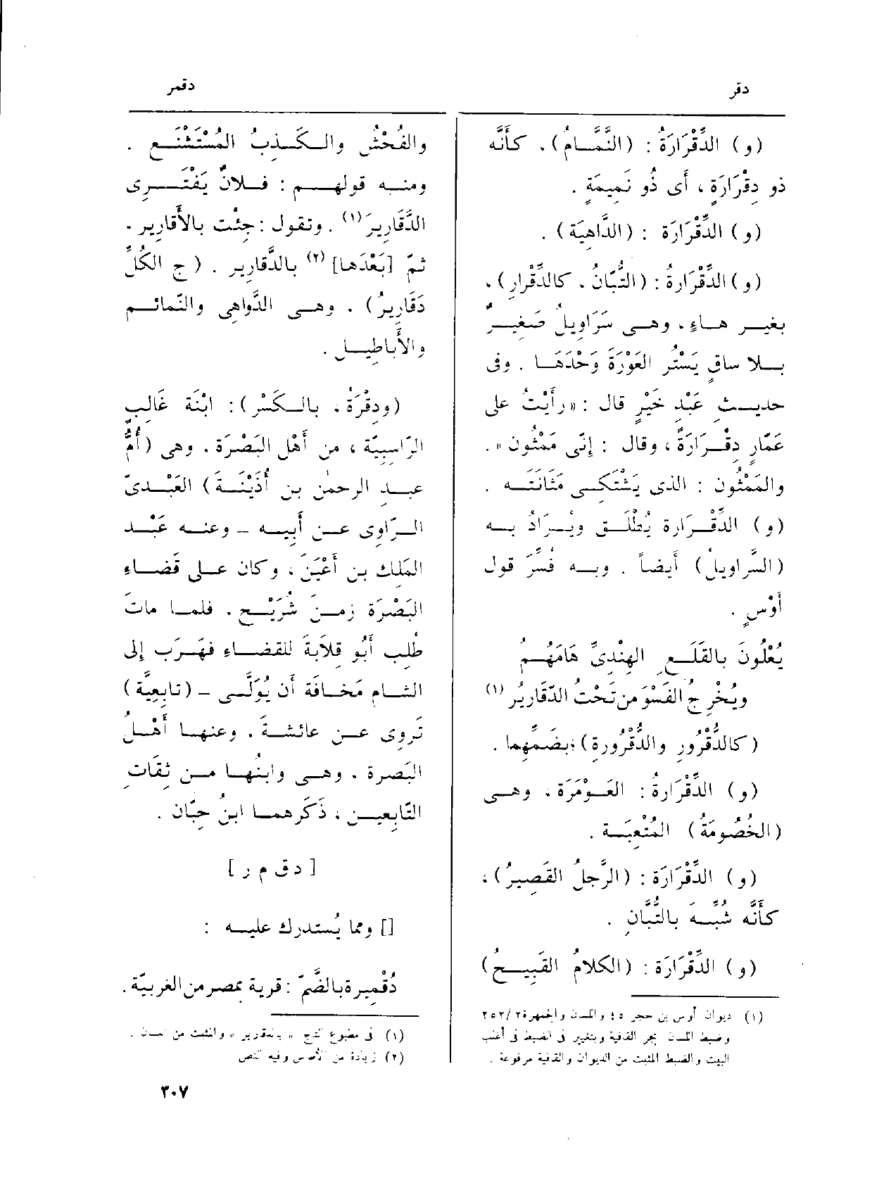 (و) الدِّقْرَارَةُ: (الكلامُ القَبِيحُ) والفُحْشُ والكَذِبُ المُسْتَشْنَع. وَمِنْه قَوْلهم: فلانٌ يَفْتَرِي الدَّقَارِيرَ. وَتقول: جِئْت بالأَقارِير، ثمّ (بَعْدَها) بالدَّقارِير. (ج الكُلِّ دَقَارِير، وَهِي الدَّواهِي والنّمائم والأَباطِيل.